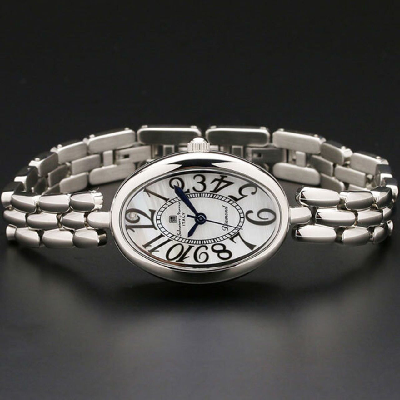 ■規格→日本製クォーツ(電池式)、1ポイントダイヤモンド、MOP文字盤、ベルトアジャスター付、3気圧防水