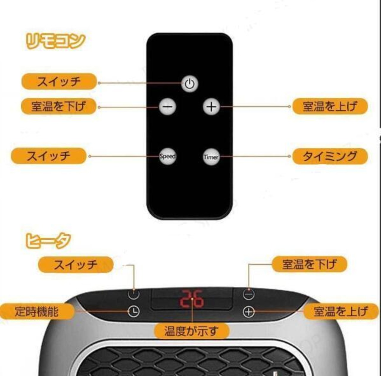 安全機能:遠隔制御、温度数値表示、3秒速熱、過熱保護、調整可能サーモスタット、安全省電力、静かな操作