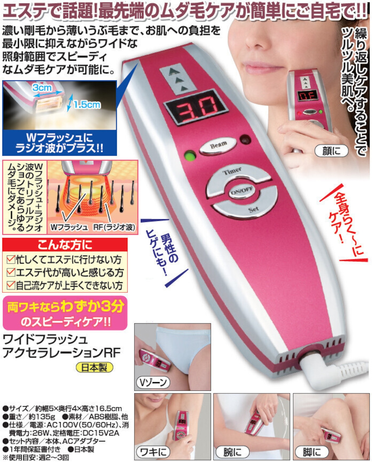 ●Wフラッシュ+ラジオ波のトリプルアクションであらゆるムダ毛にダメージ。