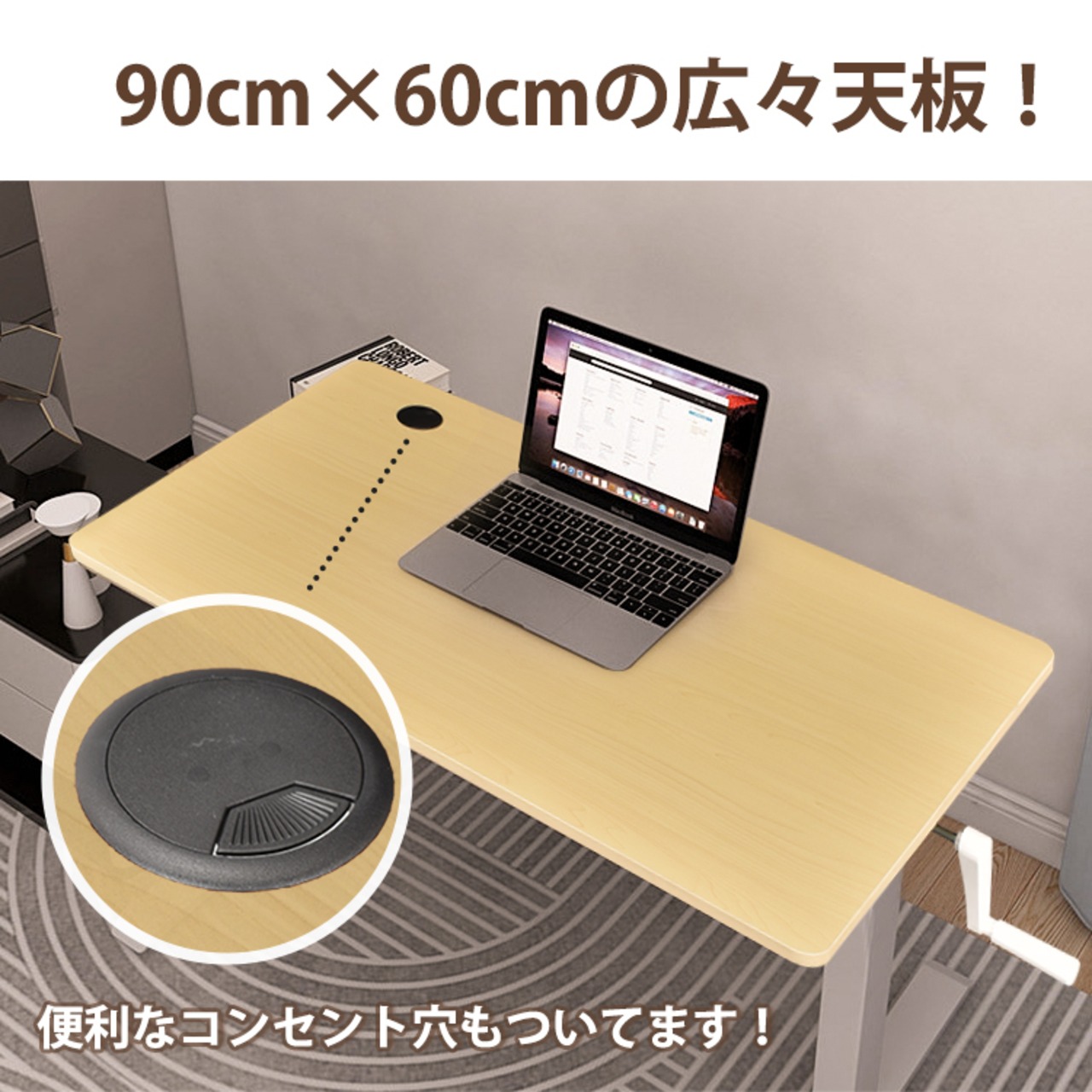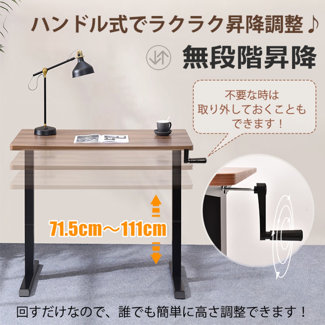 昇降デスク 手動 ハンドル 無段階昇降 高さ調整 作業効率 キャスター 2色