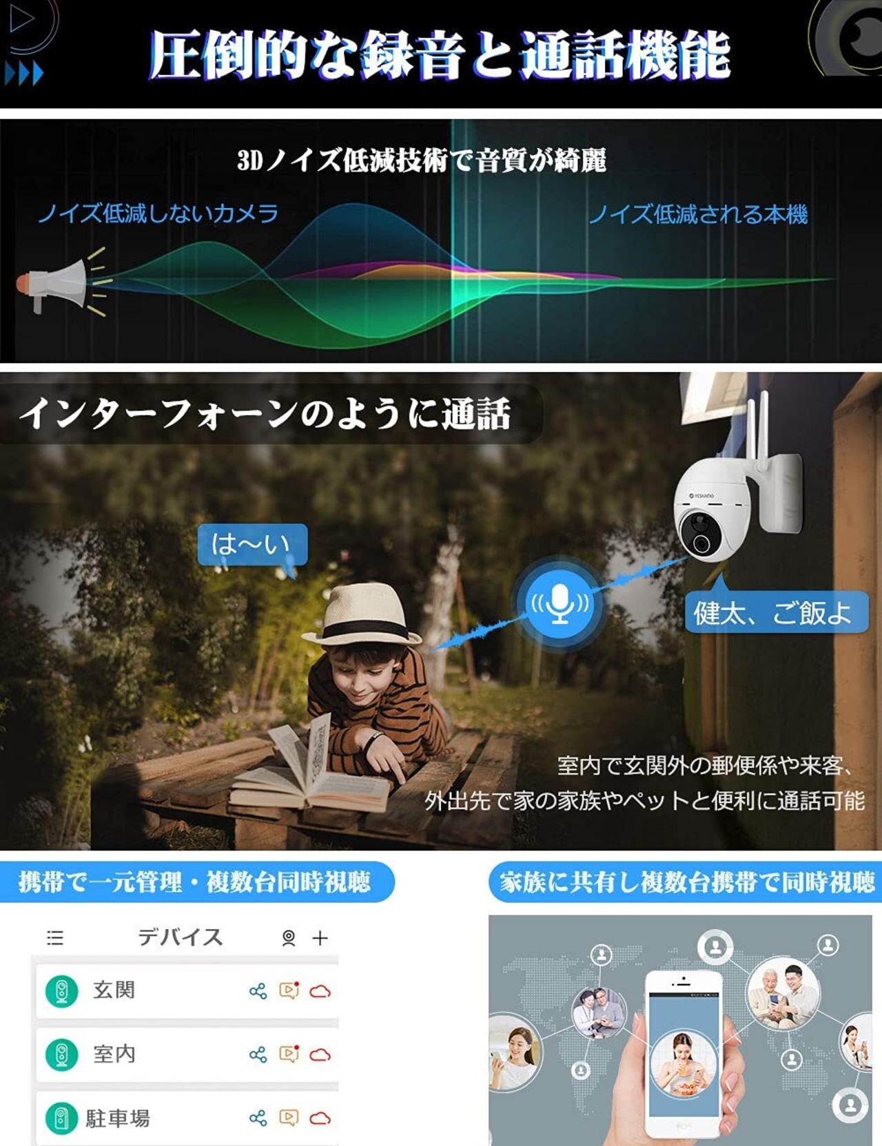 本防犯カメラは見た目でもしっかりした造り、内蔵されたマイクロフォンとスピーカーも上質、3Dノイズ低減技術を採用して音質が綺麗、現場8m範囲内の音声を正確に認識して、360°集音します。ドアカメラとして玄関外の郵便係や来客の確認、家の家族やペットとの通話、不審者の威嚇など機能が必然にして十分で、家の番人として活躍します。接続がとても簡単、素人でも1-2分間でできます。Wi-Fiカメラの設定や操作は全部携帯で実現、パソコンや録画機接続に対応しません。だから、接続後通勤しても海外出張しても携帯でバッテリー容量確認、映像視聴や再生、カメラ設定ができます。携帯1台で防犯カメラ数台を追加して管理、家族の複数台携帯で同じカメラの映像視聴ができます。