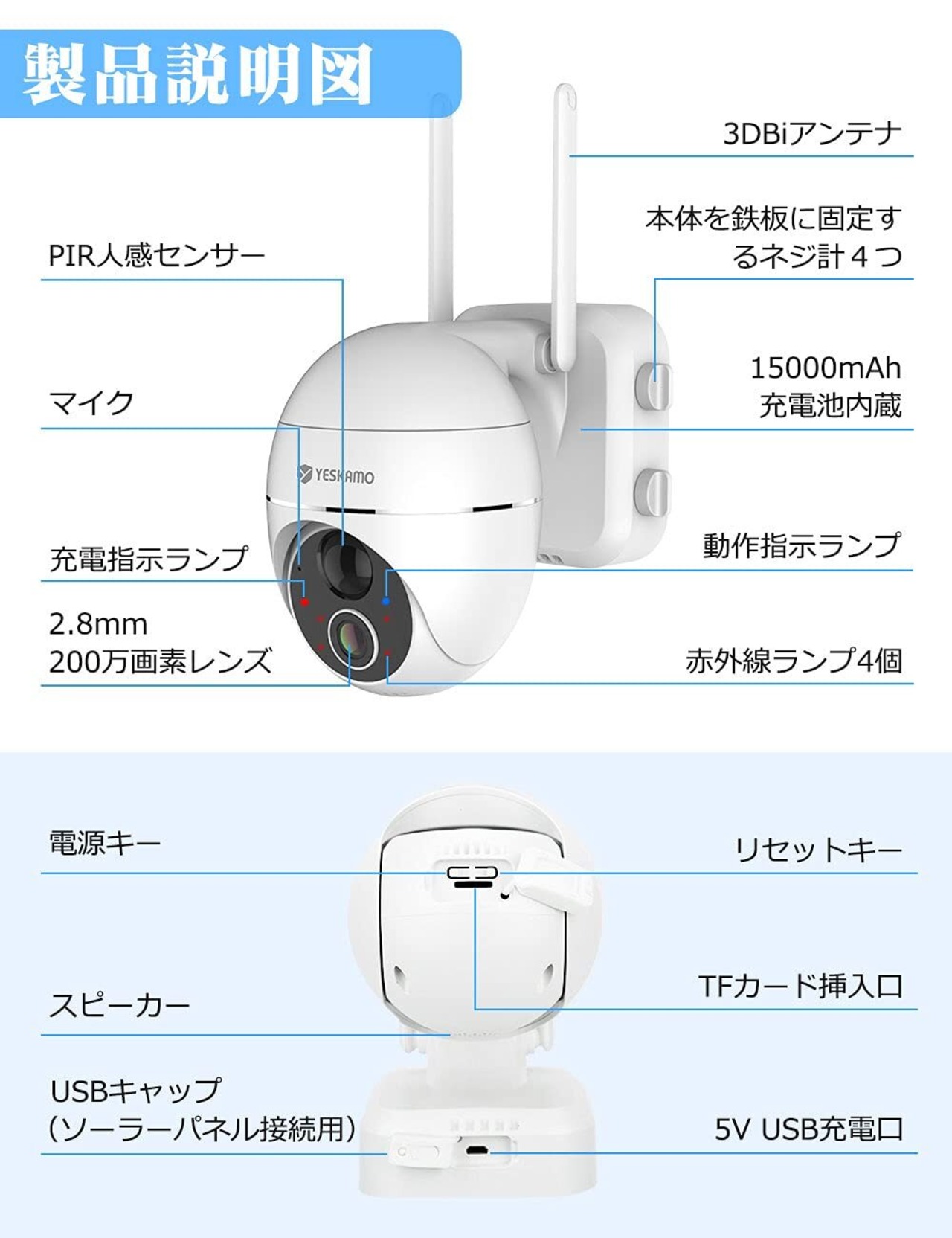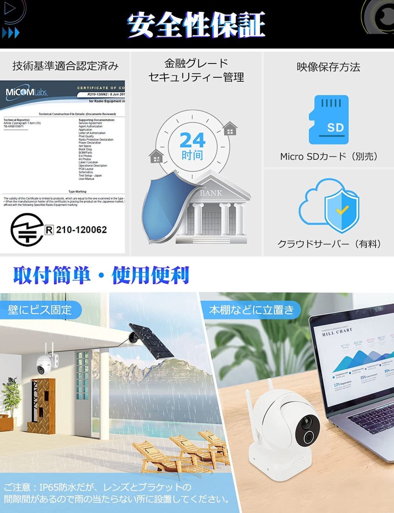 新型9000mAhほど超大容量のバッテリーが内蔵され、低消費電力技術も搭載しているので、省エネルギーで長時間稼働が可能となります。ミニ型ソーラーパネルが付いているので、電源アダプター接続不要、蓄電量を気にすることなく利用し、手間や維持費の節約になります。コンセントに制限がなく、取付が自由自在!太陽光給電、便利・エコ・経済的です。また、蓄電量は携帯で確認可能、残量が20%以下になると、アプリ通知も届きます。5G wifi帯に対応しないが、2.4G無線LANと繋いだらどこでも設置可能です。IP65防水防塵、屋外にも対応、ただし、監視カメラ本体は雨に当たらない屋根の下に設置したほうが良いです。大容量バッテリー内蔵、無線LANに対応、IP65防水防塵なので、完全無線だけでなく、室内や屋外に設置便利です。