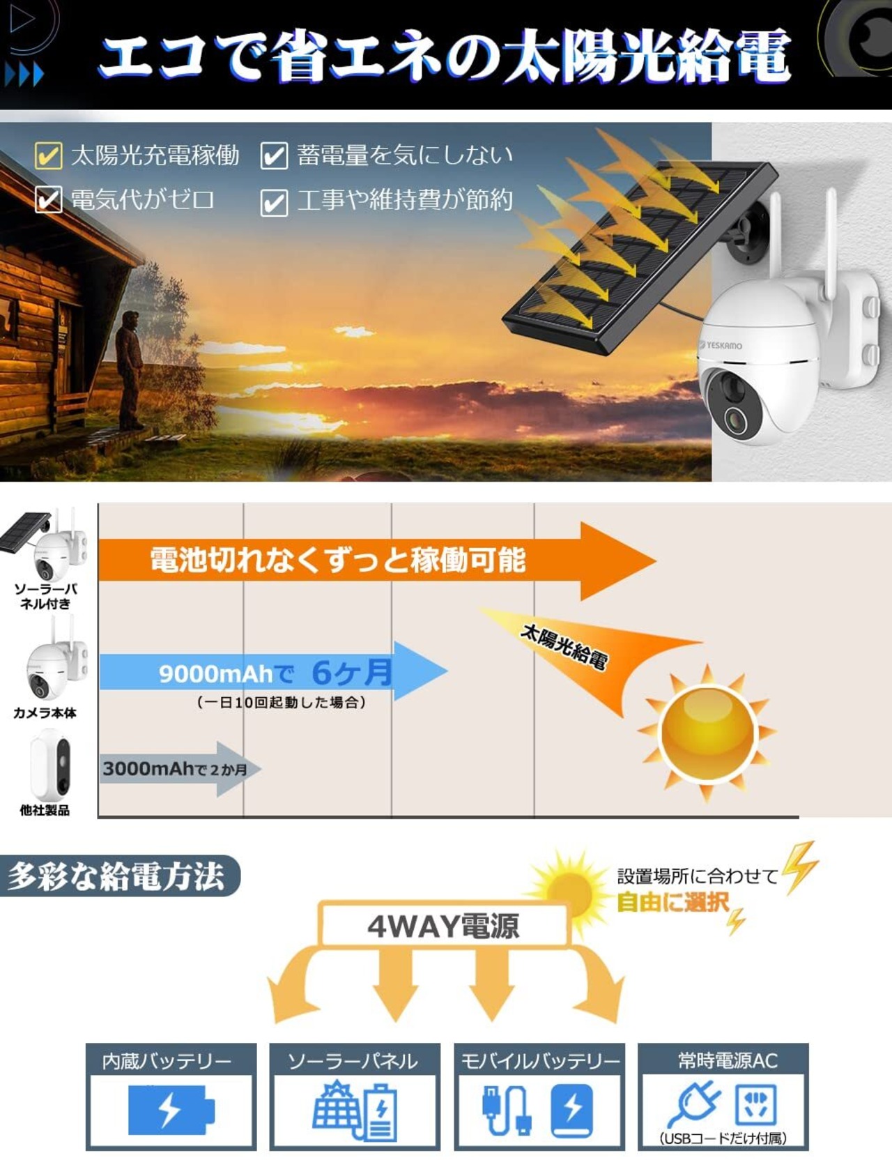 【超大容量電池が長時間稼働・太陽光給電で省エネ】