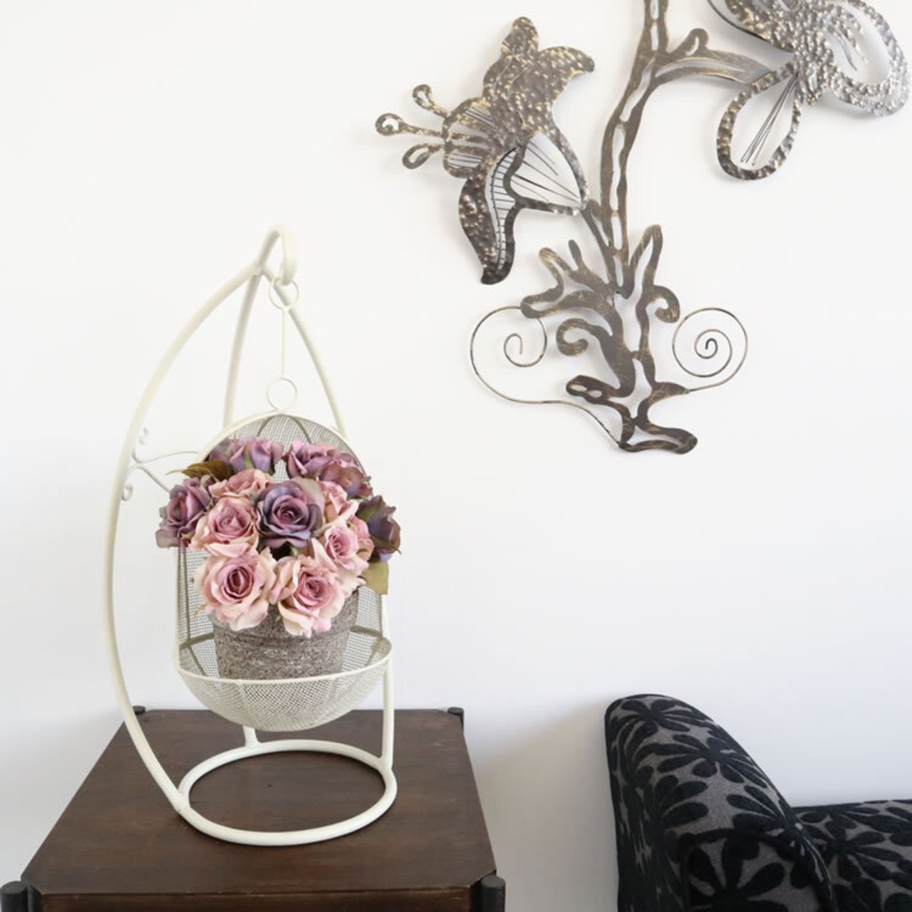 ホワイトアイアンがオシャレなハンギング(吊り型)プランター(鉢カバー)です。