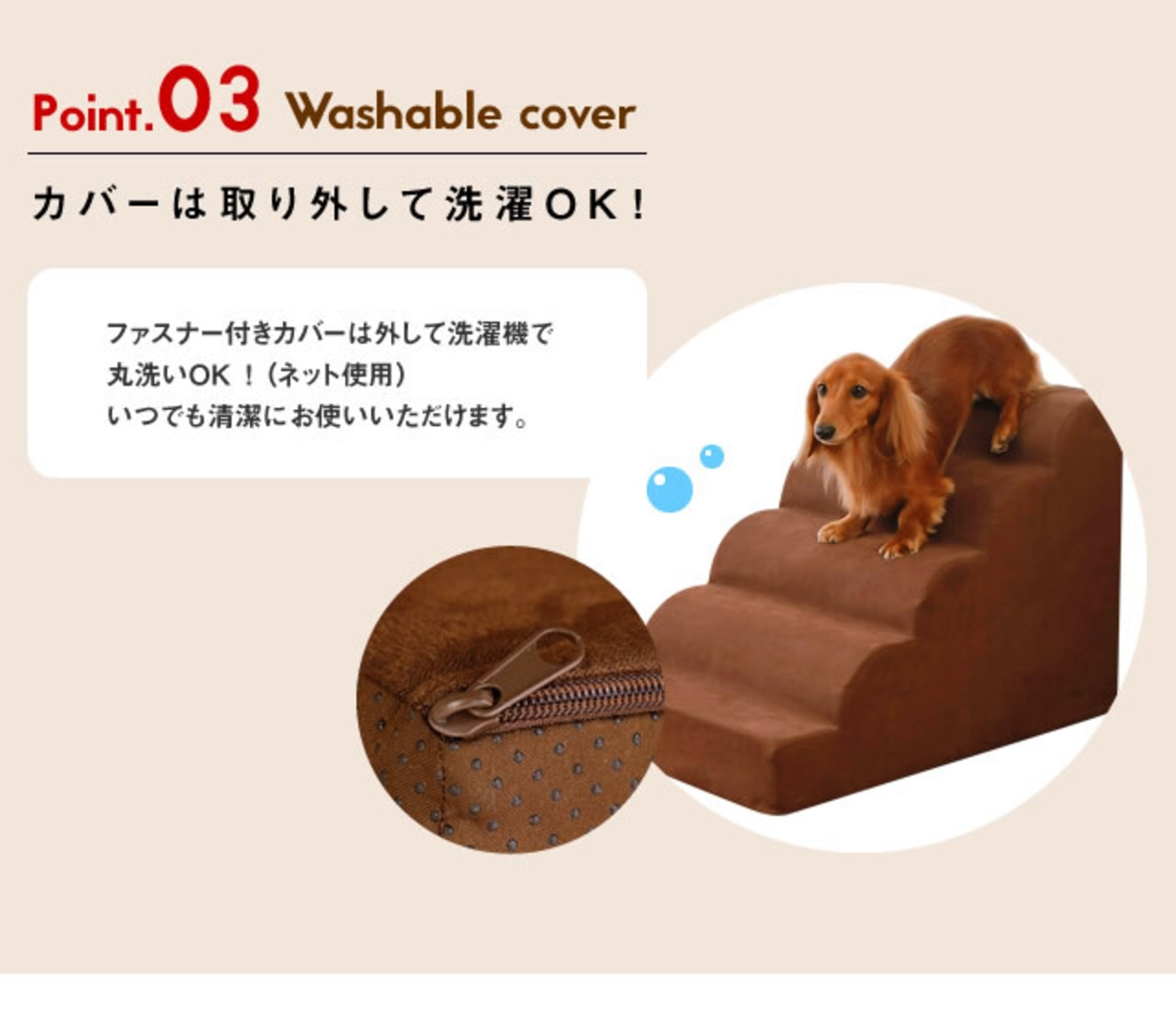 小型犬用スロープ このスロープがあればワンちゃんのお悩み解消! ●脚を引っ掛けにくい角丸の優しい設計。 ●裏面には安心の滑り止め付き。 ●カバーは取り外して洗濯OK!
