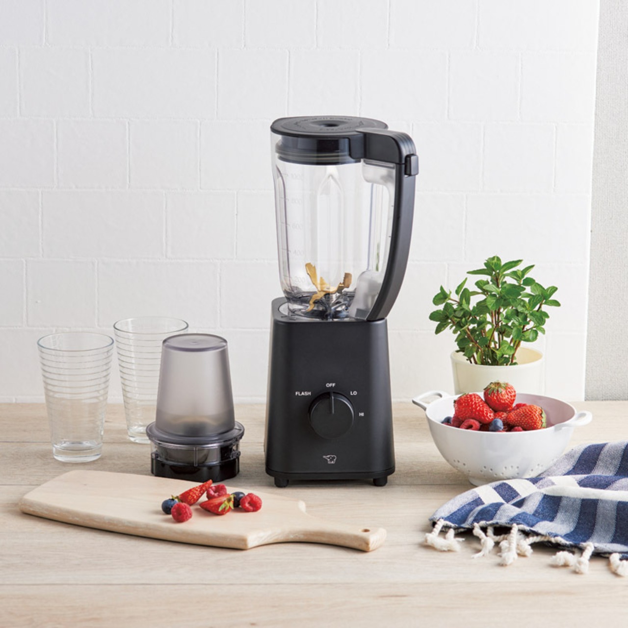 「粉砕」と「切削」、2つの役割を持たせた象印独自の「クラッシュ&カットチタンコートブレード」。軽くて丈夫&たっぷり作れる1Lミキサー容器。1人分の食材から調理可能。コードの長さ約1m。消費電力225W。