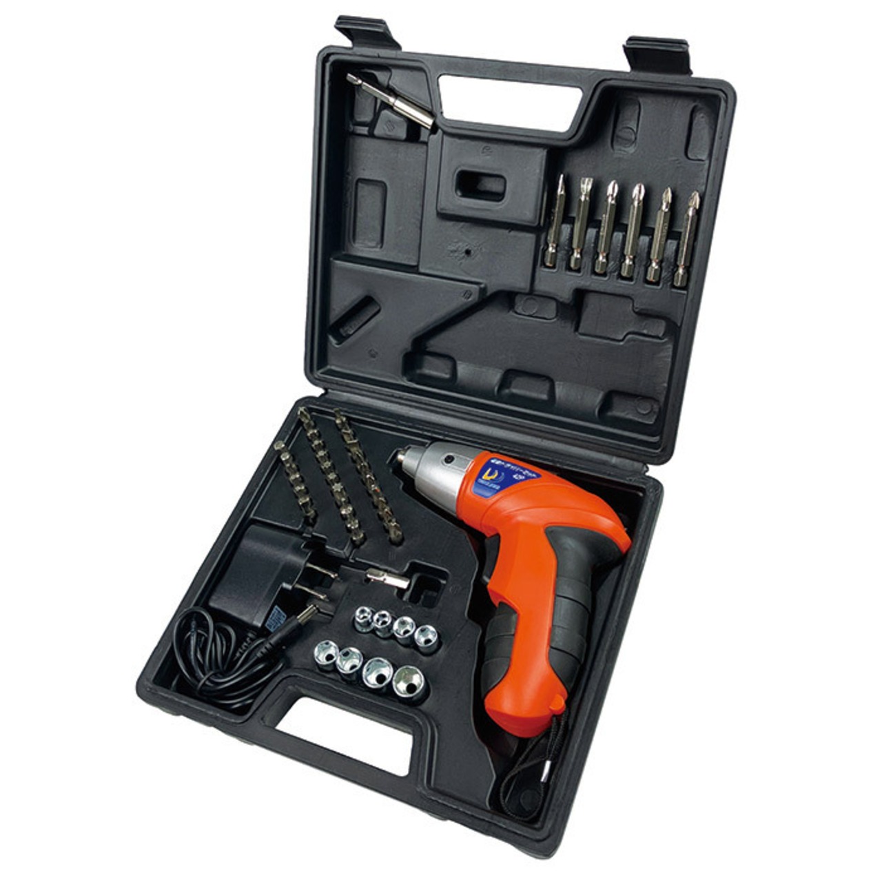 最近流行になっている電動工具類。DIY女子の間でもその使いやすさと力要らずという点で人気のアイテムとなってます。ただ、本格的に揃えるとなると大変高額になったり、何を揃えていいのか迷ったりと、購入前に悩んで困っている人も多いハズです。本製品は、基本的なネジを「締める」「ゆるめる」電動ドライバーのフルセットで、コンパクトながら充電式のコードレスタイプです。プラス・マイナス・六角・四角・星形レンチ・六角ナットなど、先端工具が専用収納ケースに収まったフルセットになってます。先端工具はマグネット式で取付け交換がカンタンなタイプ。ドライバーの回転方向(締める・ゆるめる)の切替えもワンタッチでできます。先端部分に付いてあるLEDランプがネジ部を照らしてくれる本格派。