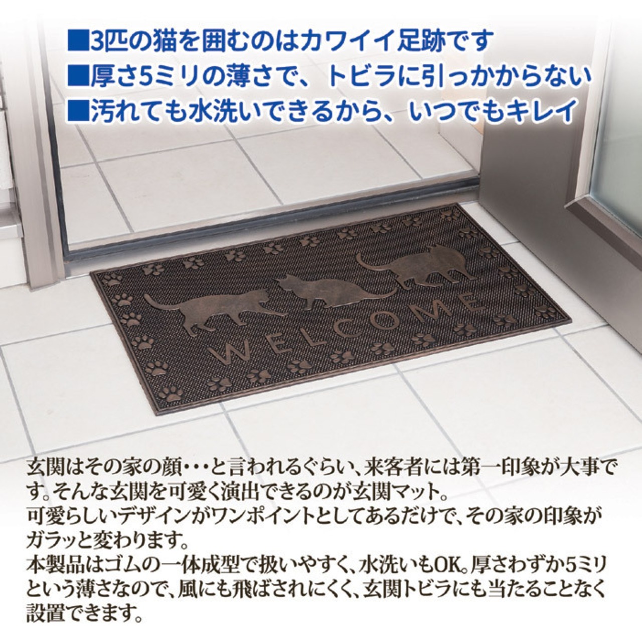 玄関はその家の顔・・・と言われるぐらい、来客者には第一印象が大事です。そんな玄関を可愛く演出できるのが玄関マット。可愛らしいデザインがワンポイントとしてあるだけで、その家の印象がガラッと変わります。本製品はゴムの一体成型で扱いやすく、水洗いもOK。厚さわずか5ミリという薄さなので、風にも飛ばされにくく、玄関トビラにも当たることなく設置できます。