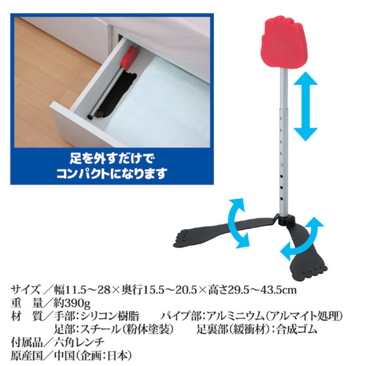 ●材質/手部:シリコン樹脂 パイプ部:アルミニウム(アルマイト処理) 足部:スチール(粉体塗装) 足裏部:(緩衝材):合成ゴム 六角レンチ:スチール(クロームメッキ)