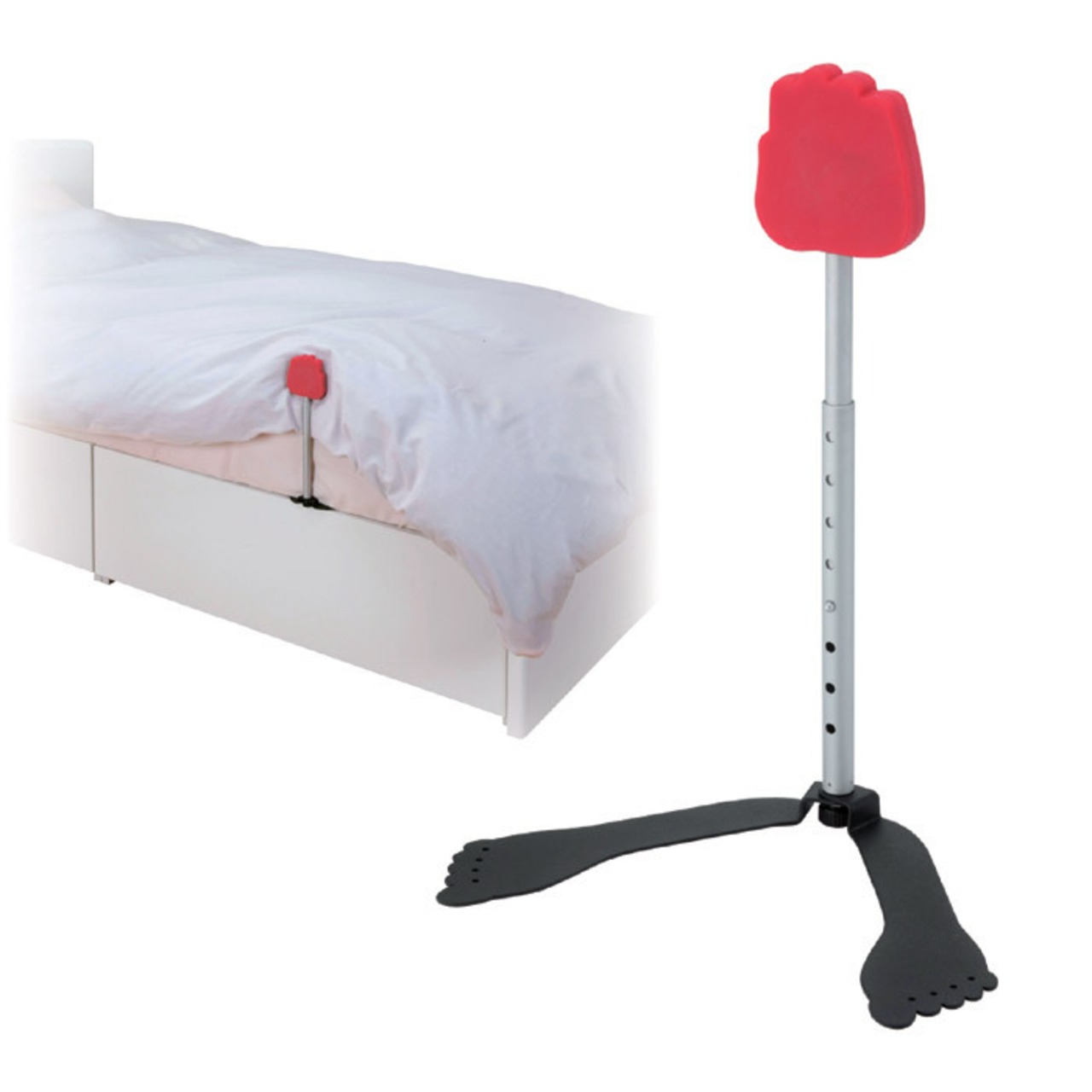 布団のずり落ち防止として便利なベッドガードも、布団から出る時に邪魔になったりしませんか。シンプルな形にすればこんなデザインになりました。単純な捧のように見えますが、布団のズレをしっかりと止める工夫がされています。赤い手のような部分がすべてシリコン素材でできているので滑り止め効果があり、布団がズレません。寝具に合せて高さ調節ができ、足部分は角度変更もできるので、自由に設置が可能です。
