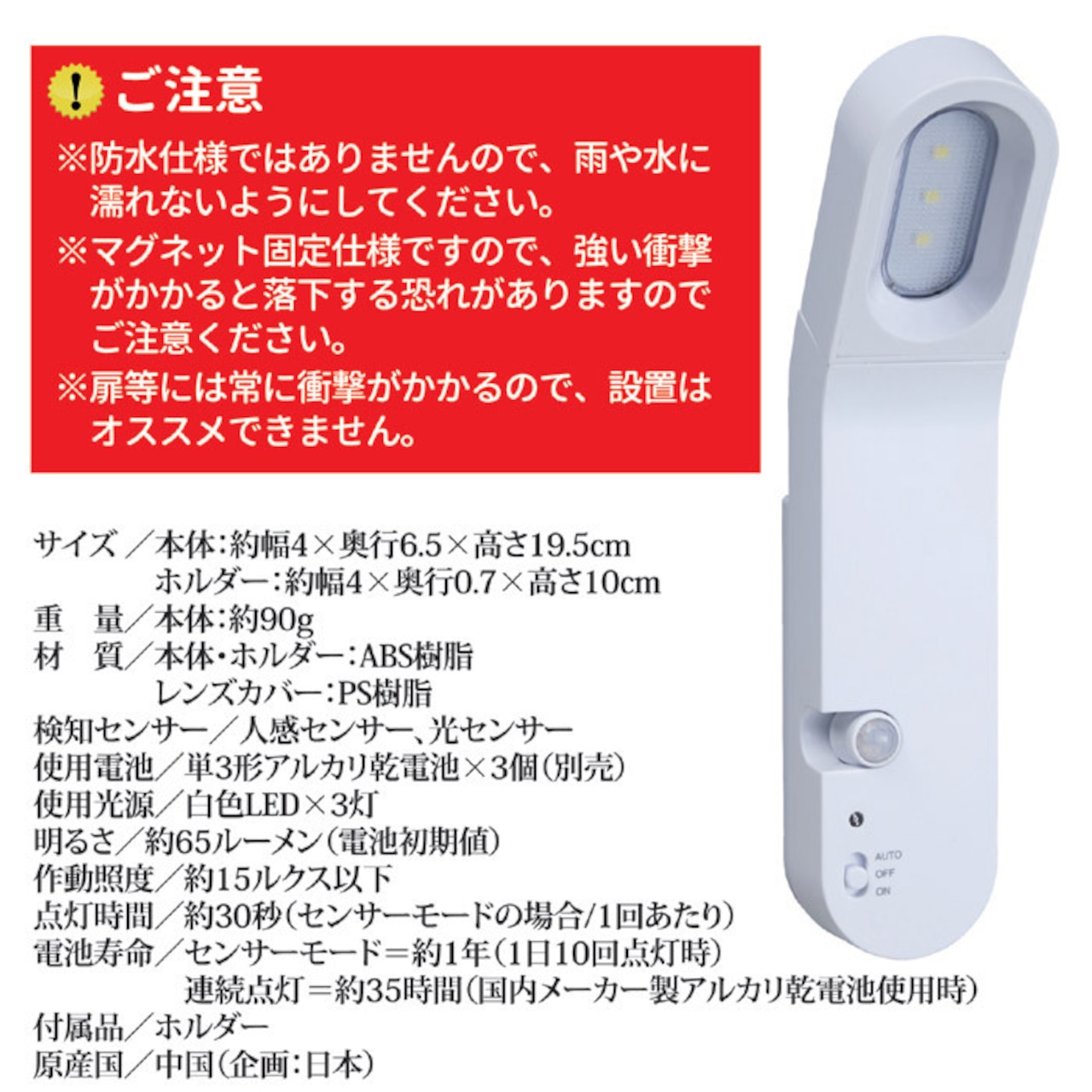 ●電池寿命/センサーモード/約1年(1日10回点灯時)、連続点灯/約35時間(国内メーカー製アルカリ乾電池使用時)