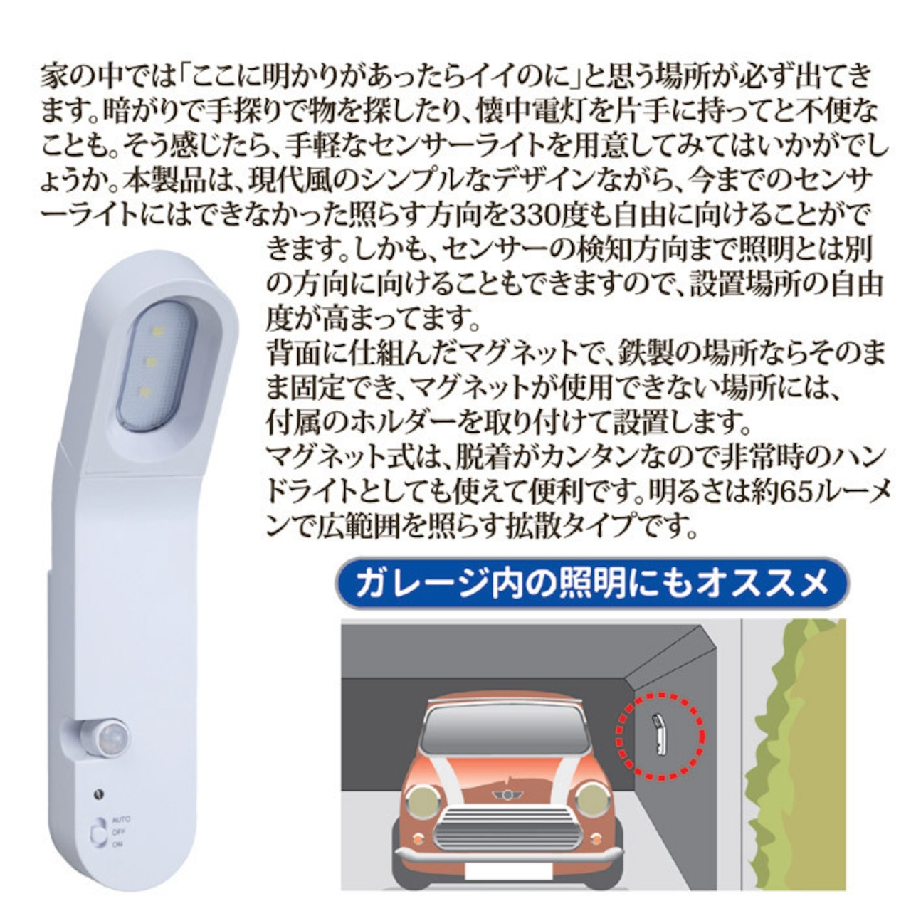 家の中では「ここに明かりがあったらイイのに」と思う場所が必ず出てきます。暗がりで手探りで物を探したり、懐中電灯を片手に持ってと不便なことも。そう感じたら、手軽なセンサーライトを用意してみてはいかがでしょうか。本製品は、現代風のシンプルなデザインながら、今までのセンサーライトにはできなかった照らす方向を330度も自由に向けることができます。しかも、センサーの検知方向まで照明とは別の方向に向けることもできますので、設置場所の自由度が高まってます。背面に仕組んだマグネットで、鉄製の場所ならそのまま固定でき、マグネットが使用できない場所には、付属のホルダーを取り付けて設置します。マグネット式は、脱着がカンタンなので非常時のハンドライトとしても使えて便利です。明るさは約65ルーメンで広範囲を照らす拡散タイプです。