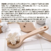 熟練職人が丹念に仕上げた天然毛のブラシ。お風呂で「気持ち良く身体を洗いたい」でも腕が疲れるし、背中は特に洗い辛い・・・と、そんな方にオススメの手作りボディブラシです。毛足が3センチと非常に長く、身体に無理なく滑らかにラクーに洗うことができます。独特の「桜の花びら」をイメージした植え込み形状が、独特の洗い心地をお届けします。厳選された白馬毛を天然木ひのき材の持ち手に「さくら形」に植え付けました。白馬毛のボディブラシさくらでブラッシングすることで、桜の花びら一枚一枚が微妙に自由に動き、心地よい刺激と爽やかさをお肌に感じます。ソープの泡立ちが良く、毛穴の奥まで清潔にします。