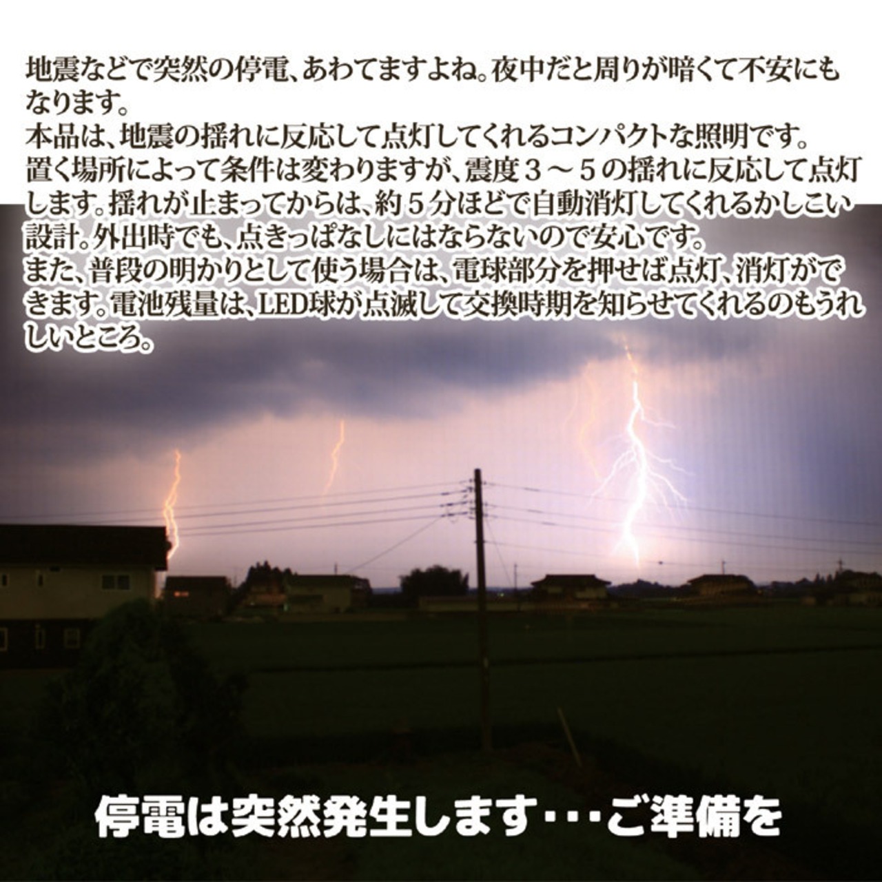 地震などで突然の停電、あわてますよね。夜中だと周りが暗くて不安にもなります。本品は、地震の揺れに反応して点灯してくれるコンパクトな照明です。置く場所によって条件は変わりますが、震度3~5の揺れに反応して点灯します。揺れが止まってからは、約5分ほどで自動消灯してくれるかしこい設計。外出時でも、点きっぱなしにはならないので安心です。また、普段の明かりとして使う場合は、電球部分を押せば点灯、消灯ができます。電池残量は、LED球が点滅して交換時期を知らせてくれるのもうれしいところ。