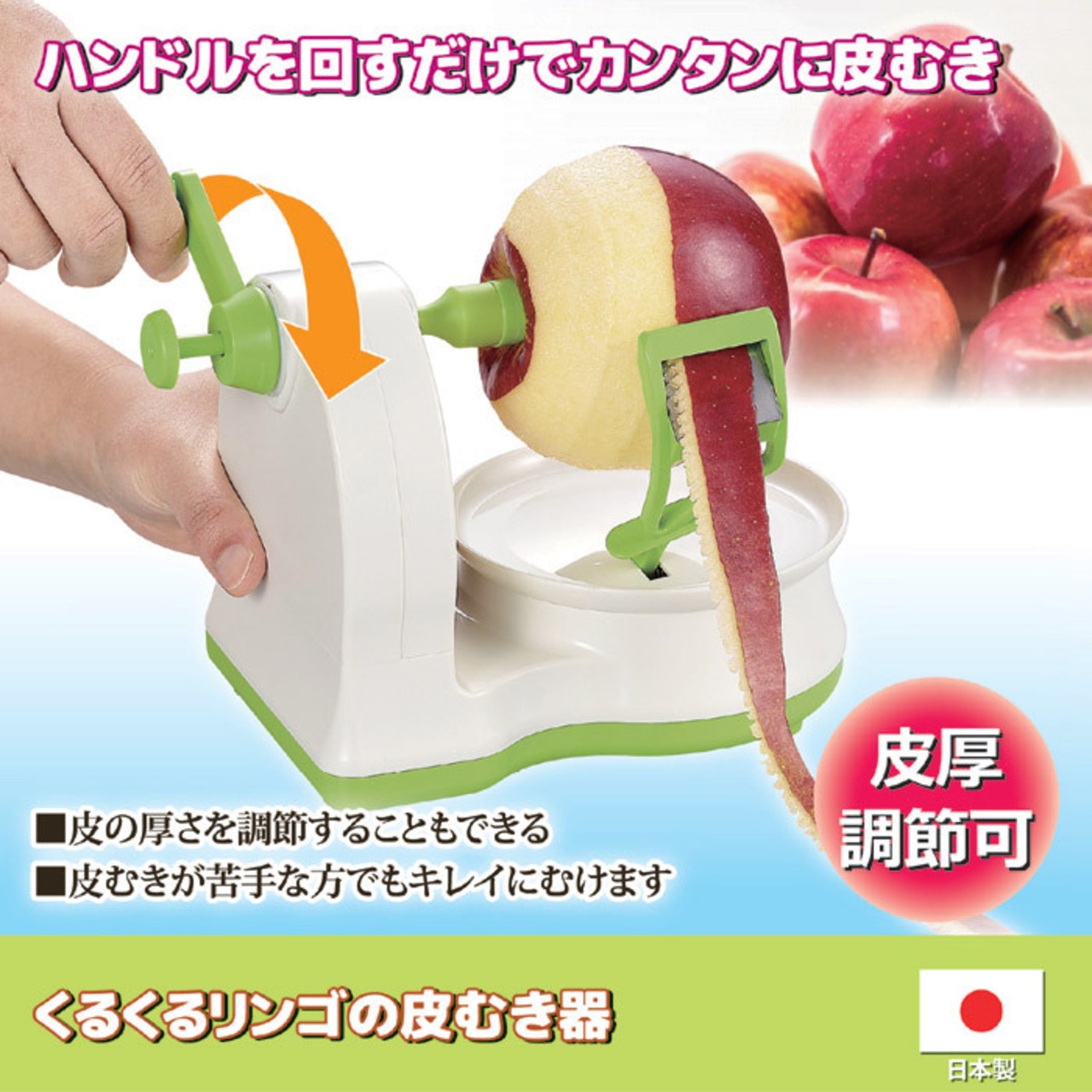 リンゴは食べたいけれど、あの皮むきが上手にできない・・・と言う方にオススメの皮むき器。リンゴをピンに差し込んでセットし、後はハンドルを回すだけで面白いほどキレイにむけます。皮を厚くしたり薄くむけるようにしたりもできます。