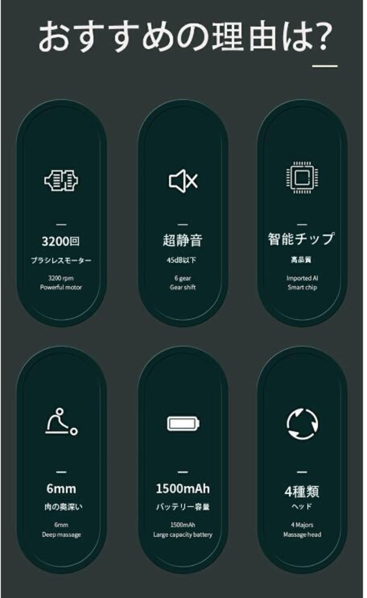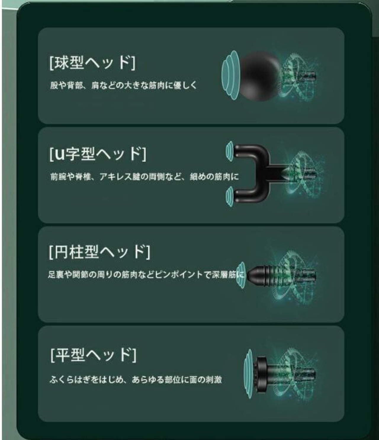 平面ヘッド:各筋肉部位のリラックスそして形作ることのために適しています。丸形ヘッド:腕、腰、背中、お尻、太もも、ふくらはぎなどの大筋肉群に適しています。円筒ヘッド:経絡、手のひら、足底などの衝撃深層組織に適しています。U型ヘッド:首、脊椎、足の腱をするのに適しています。
