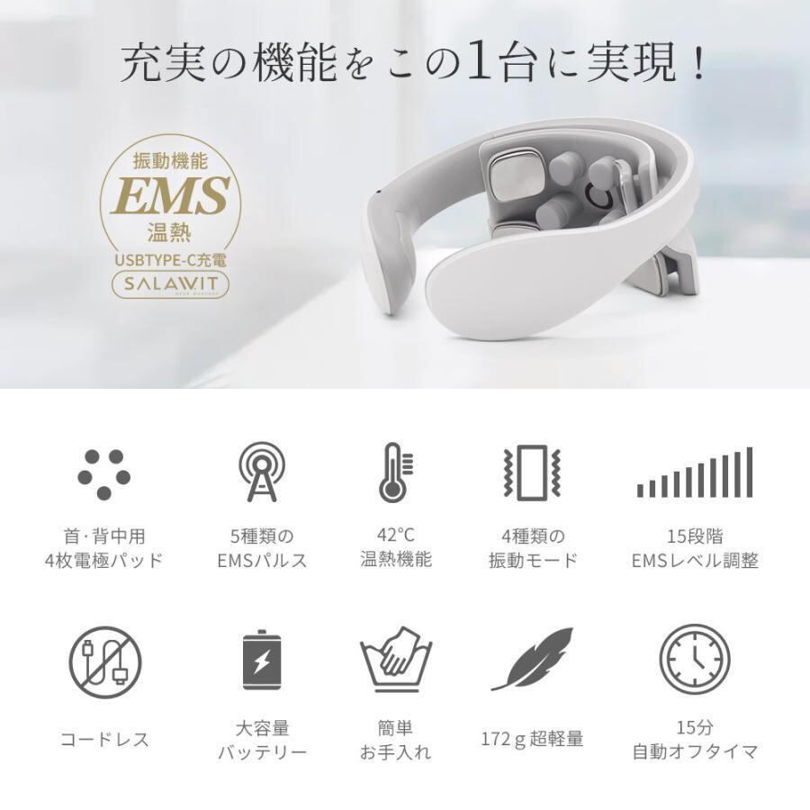 疲れた首や肩をほぐす、ネックマッサージャーが新登場!電気刺激と振動モードを組み合わせた特殊なEMS機能で、深層部の筋肉まで効果的にマッサージします。さらに、温熱機能も搭載しており、血行促進やリラックス効果も期待できます。ストレスや疲労に悩まされる現代人にぴったりのアイテムです。