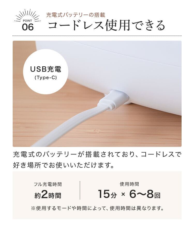 ■カラー ホワイト■付属品 本体、USBケーブル(1m)■仕様強さとモード選択:赤-強モード、緑-リラックスモード、青-弱モードヒーターモード:1回:低温モード(約38度)、2回:高温モード(約48度)■バッテリー2時間でフル充電でき毎回15分を6〜8回使用可能。