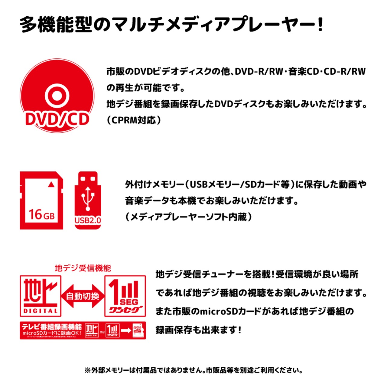 ・リモコン(試用電池付) ・miniB-CASカード ・ACアダプター・12V車用シガーソケットアダプター ・充電用USBケーブル・車載用バッグ ・TV受信用簡易アンテナ ・AV接続ケーブル・イヤホン ・取扱説明書 ・保証書