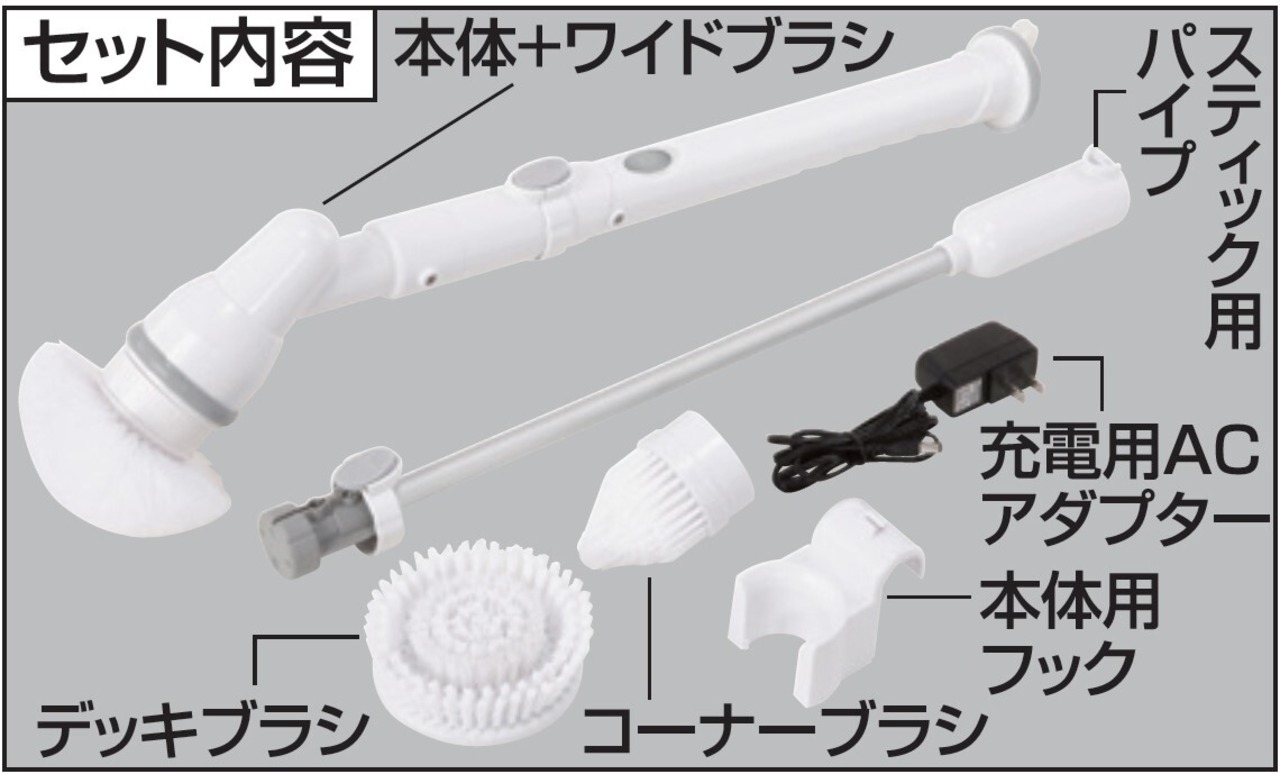 本体ヘッド部、スティック用パイプ、グリップ部、ワイドブラシ、コーナーブラシ、デッキブラシ、本体用フック、充電用ACアダプター、取扱説明書