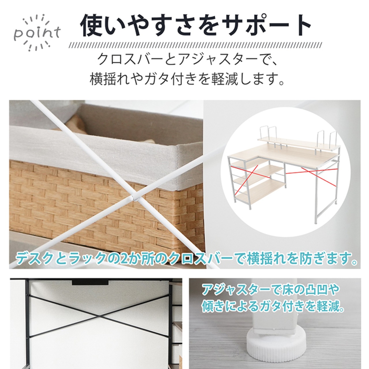 ■クロスバーとアジャスターで、横揺れやガタ付きを軽減します。