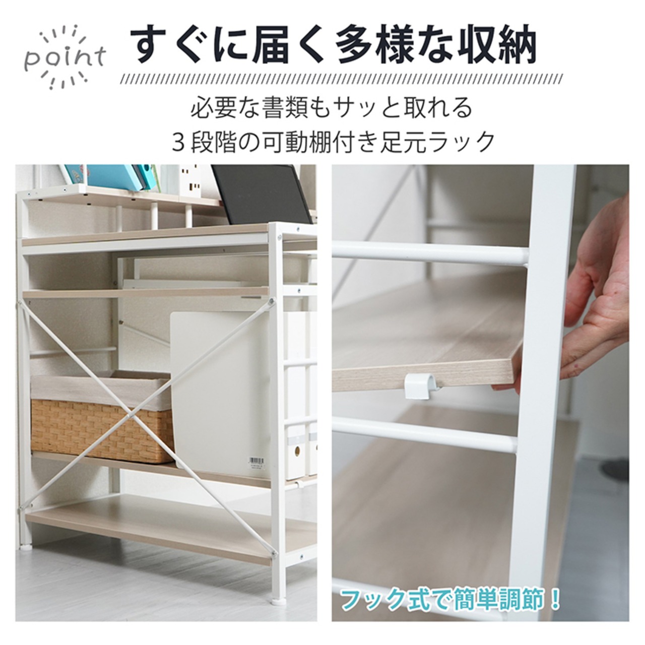■すぐに手が届く、デスク下のラック付き。