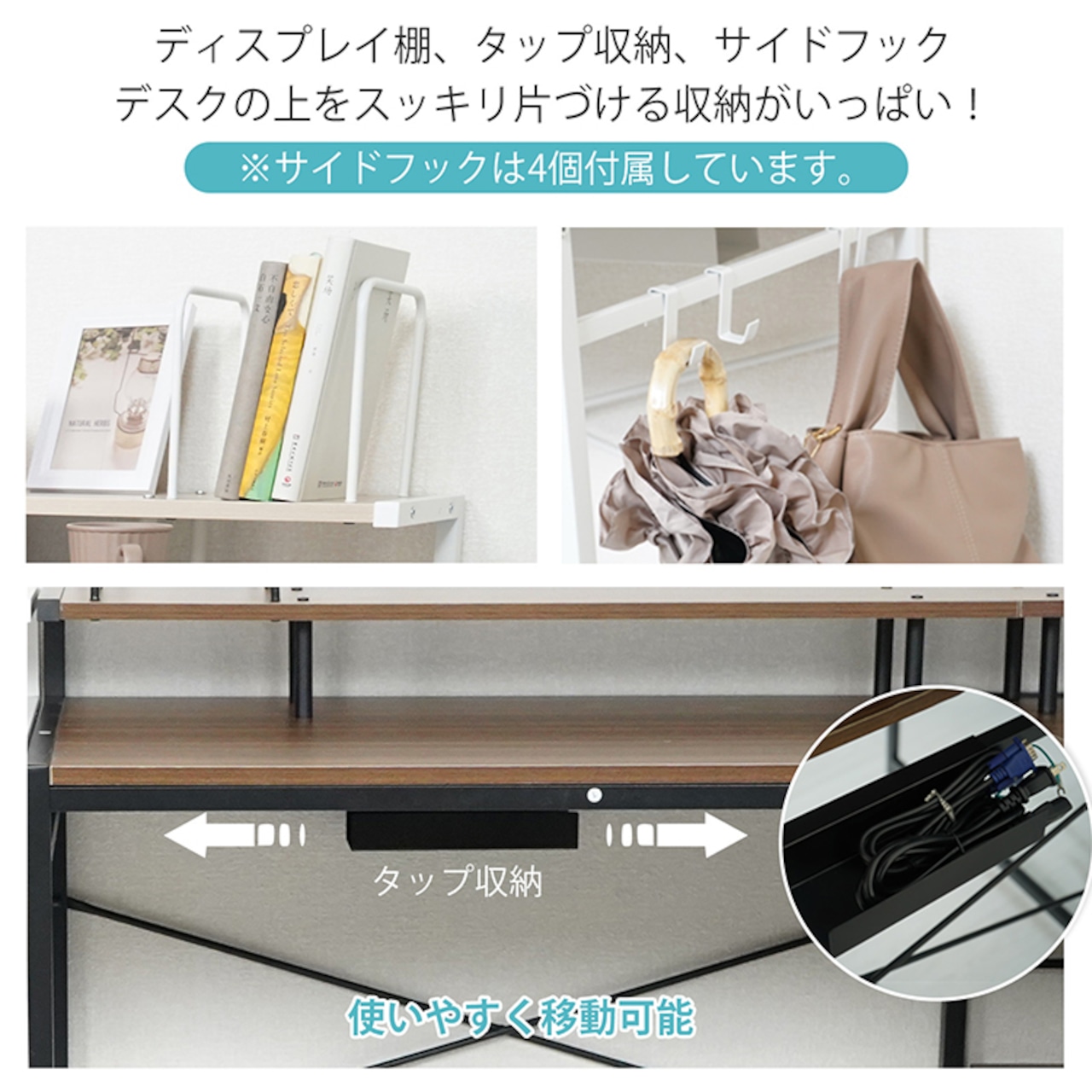 ■物が掛けられるサイドフック4個付き。