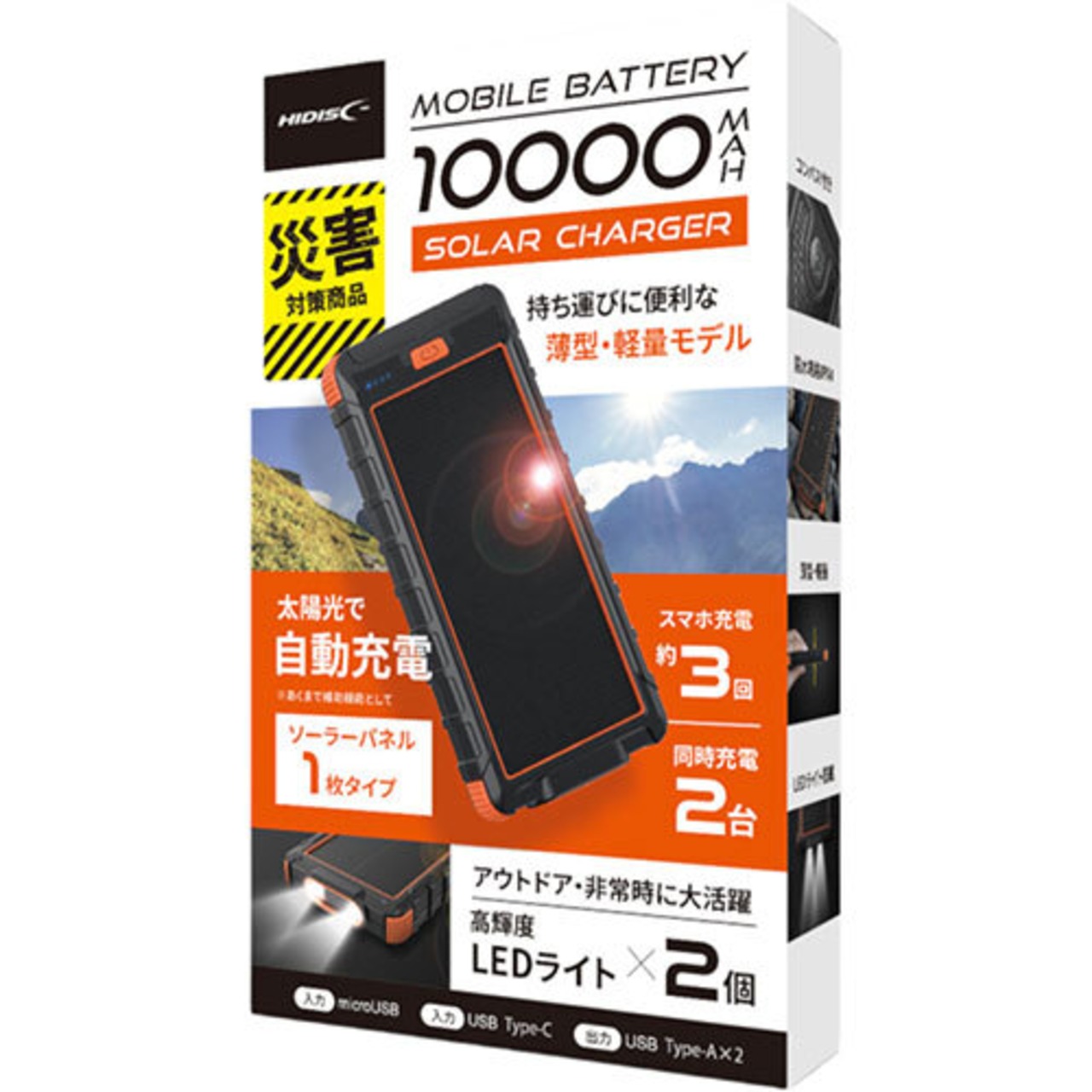 HIDISC ソーラーパネルx1LEDライト付き 10000mAh モバイルバッテリー