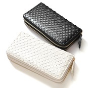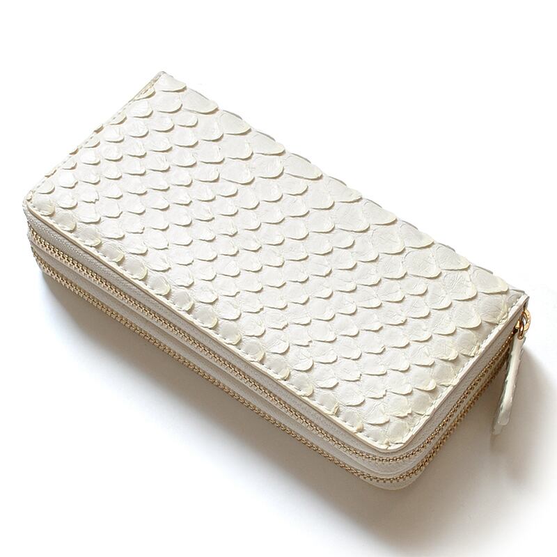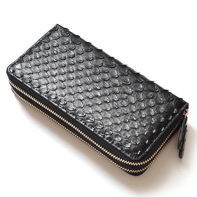 継ぎ目のない一枚取り錦蛇皮を使用したダブルファスナーのラウンド長財布。