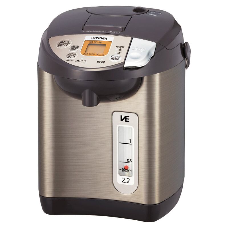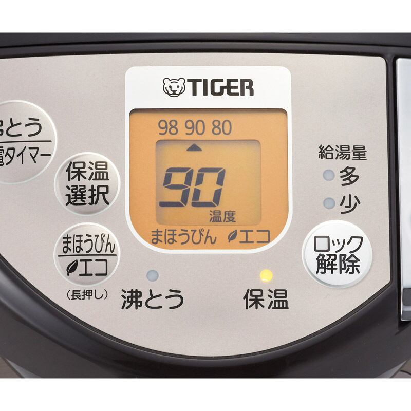 たっぷり沸かしてまほうびんで保温の電気まほうびん。蒸気を本体の外に出さない「蒸気レス」構造の安心・安全設計。給湯は押しやすい「レバー式電動給湯」と、プラグを抜いても給湯できる「コードレスエアー給湯」。4段階保温温度選択(98・90・80・まほうびん)機能付。コードの長さ約1m。消費電力700W。