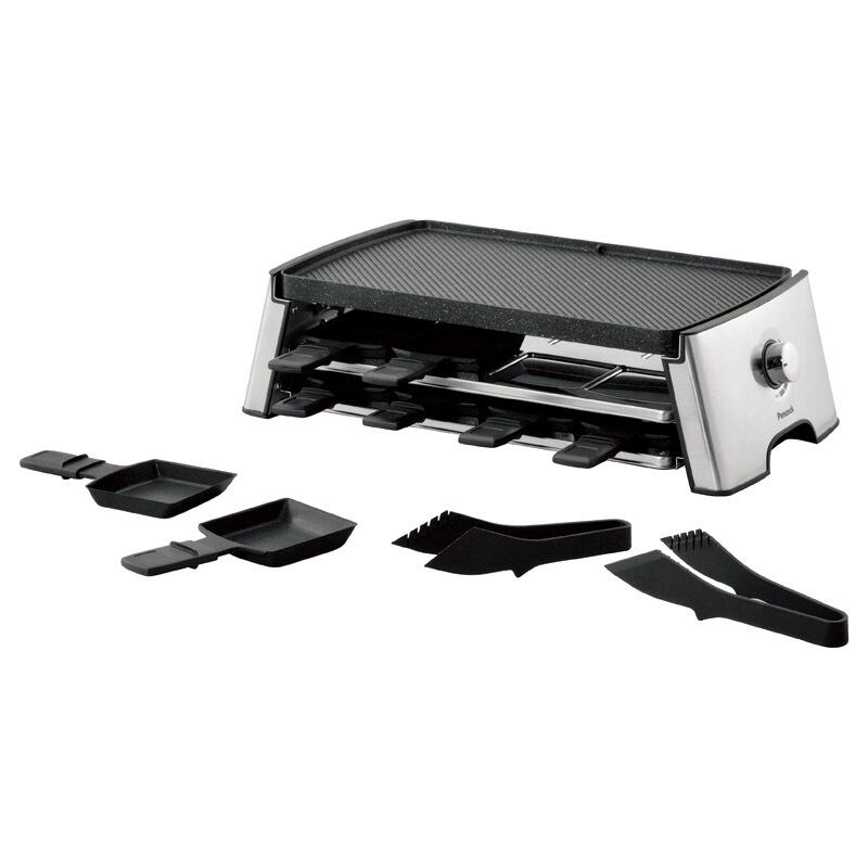 チーズや目玉焼き等色々な使い方のできるミニパン8個付き。耐久性に優れ食材がつかみやすいトング2個付き。コードの長さ1.8m。消費電力1300W。