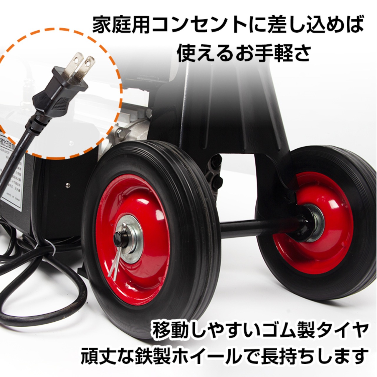 頑丈な鉄製ホイールで移動しやすいゴム製タイヤ