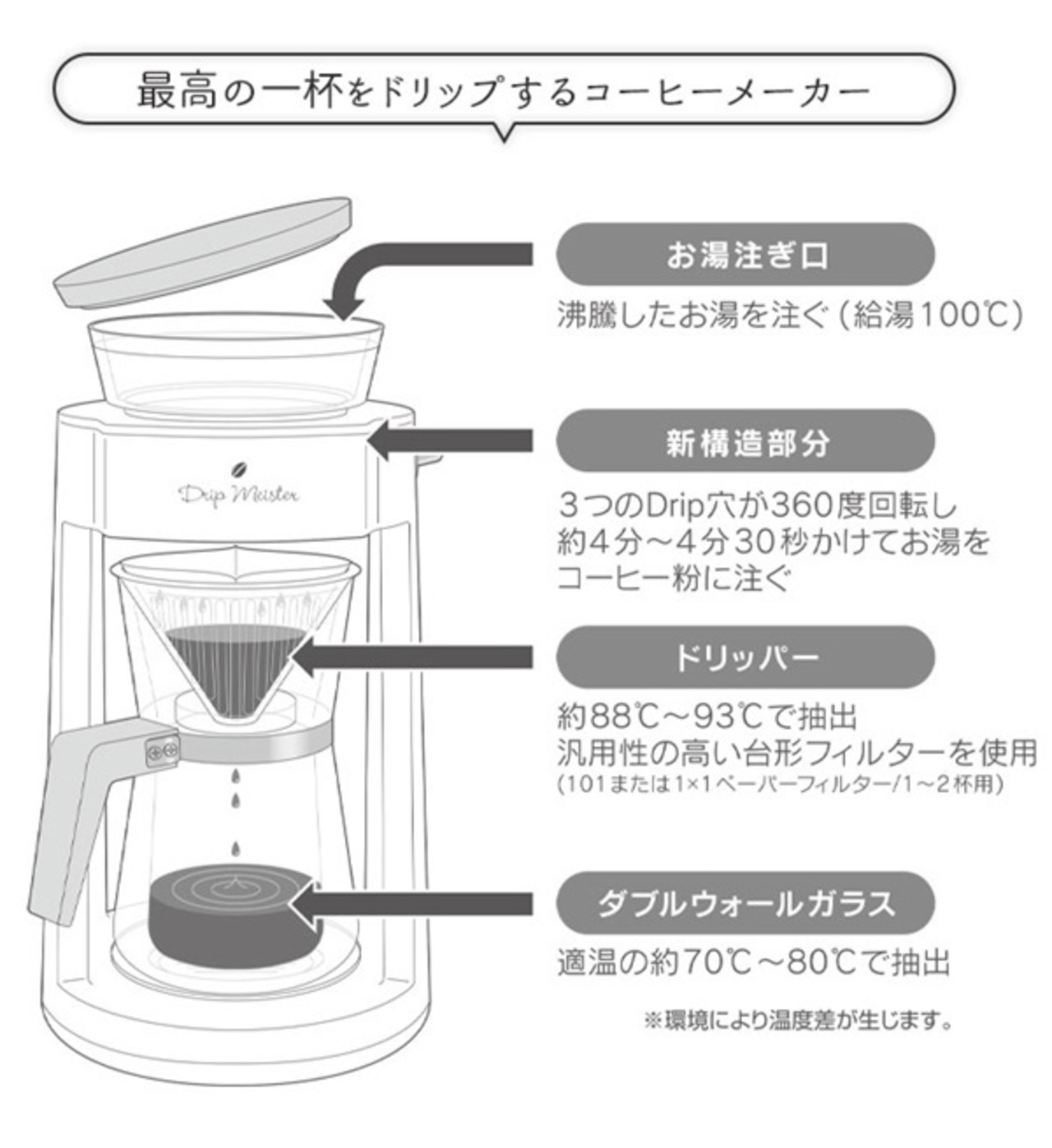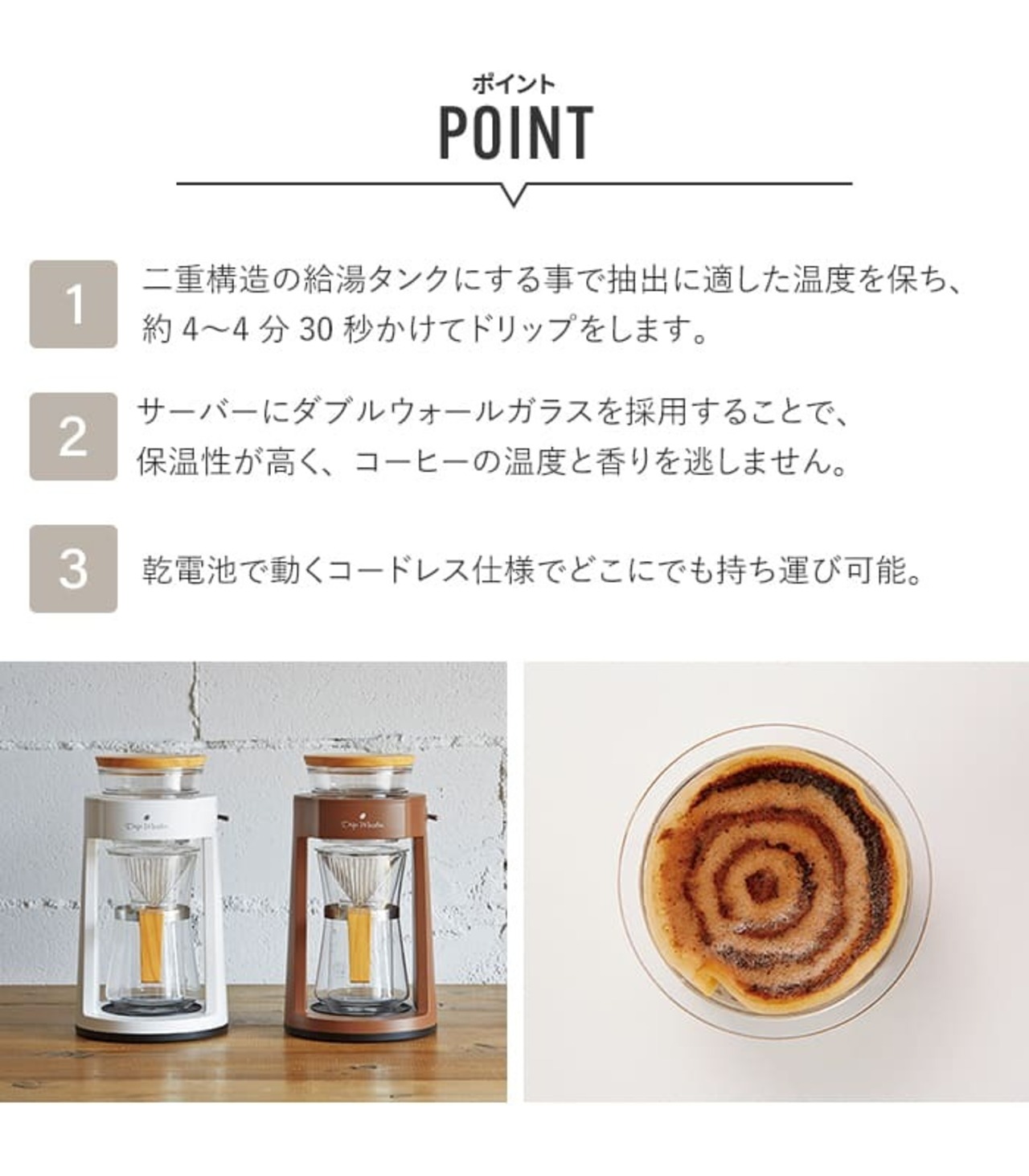 ハンドドリップの厳しい温度管理や抽出速度、抽出理論を研究したコーヒーメーカー。給湯タンク内の直径0.9ミリの3つのドリップ穴が毎分3周/360度回転し、一定の速度でお湯をコーヒー粉にそそぎます。二重構造の給湯タンクにする事で抽出に適した温度を保ち、約4~4分30秒かけてドリップをします。サーバーにダブルウォールガラスを採用することで、保温性が高く、コーヒーの温度と香りを逃しません。乾電池で動くコードレス仕様でどこにでも持ち運び可能。