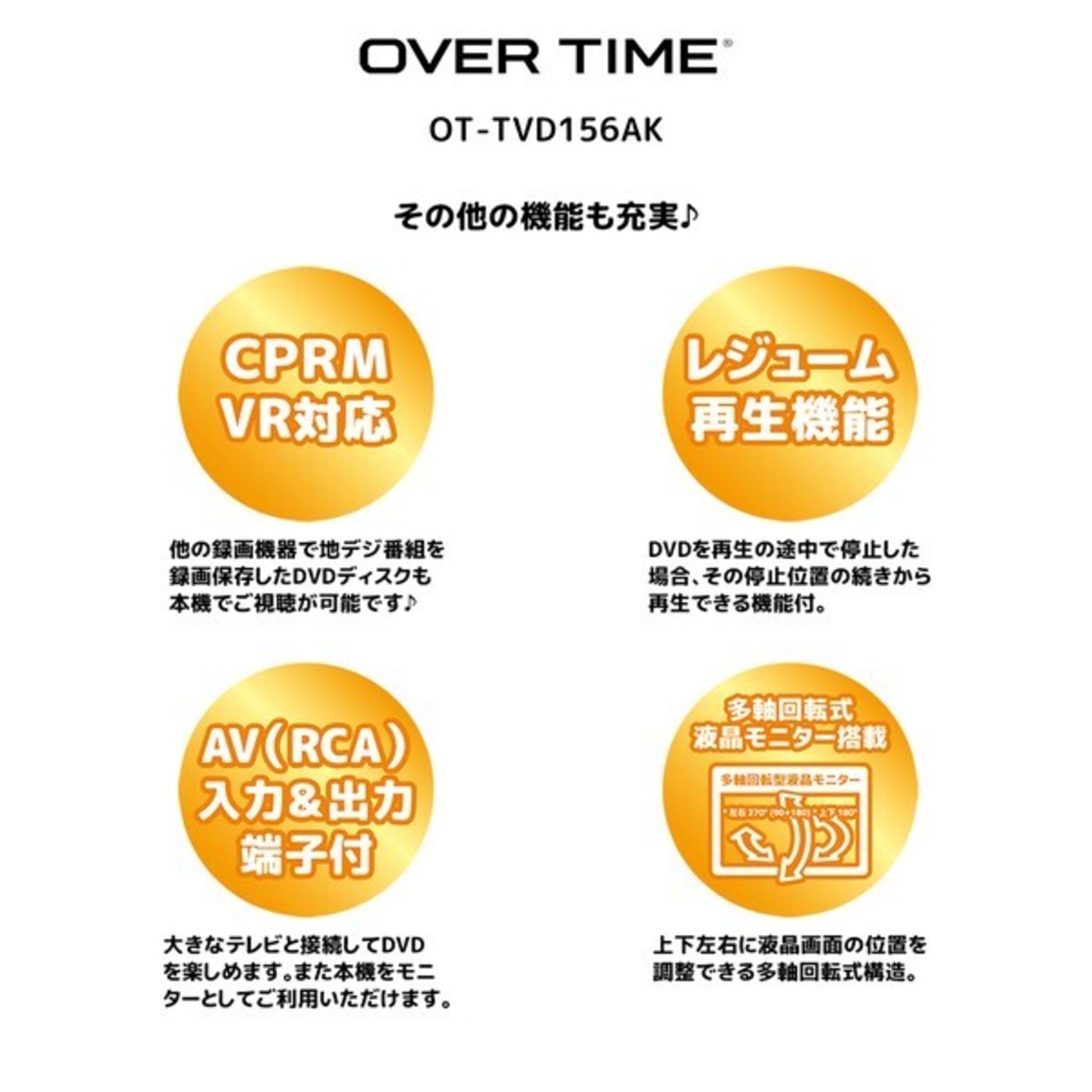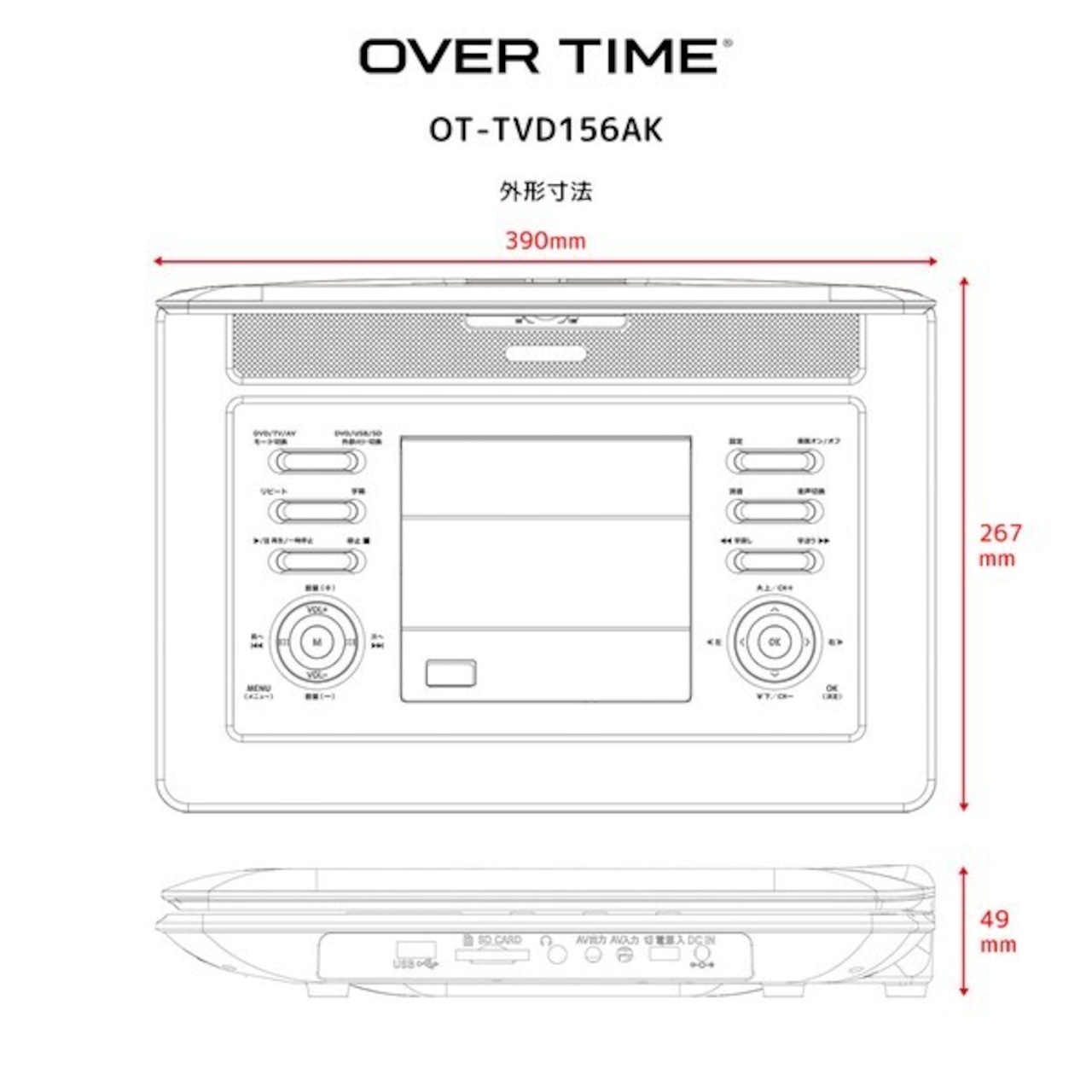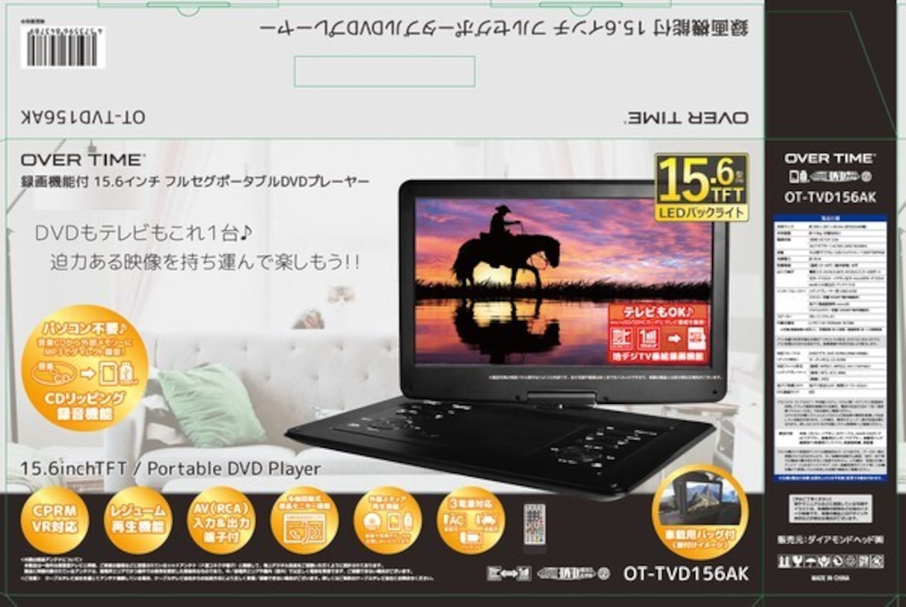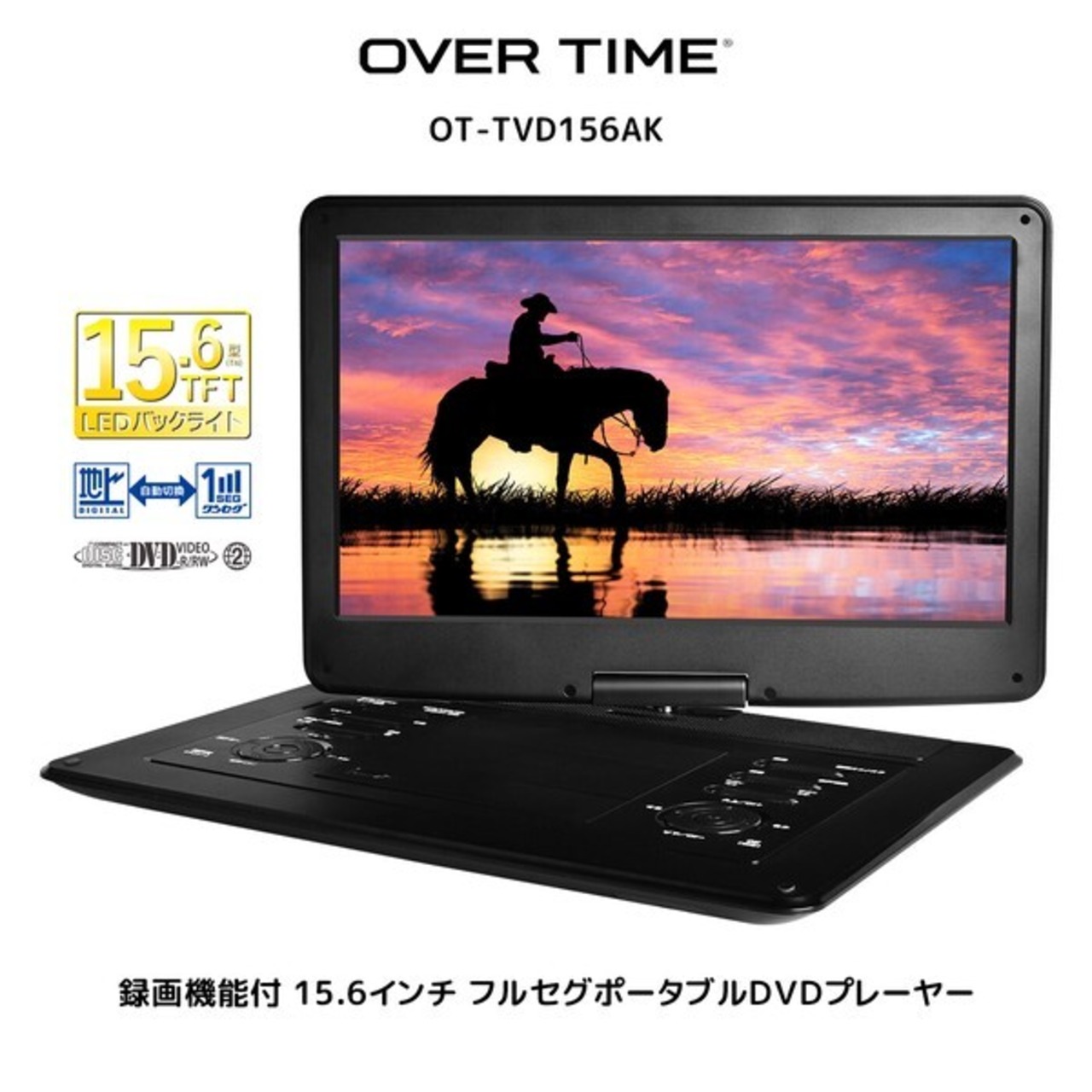 【2024年2月中旬入荷予定】OVER TIME 15.6インチ フルセグポータブルDVDプレイヤー OT-TVD156AK