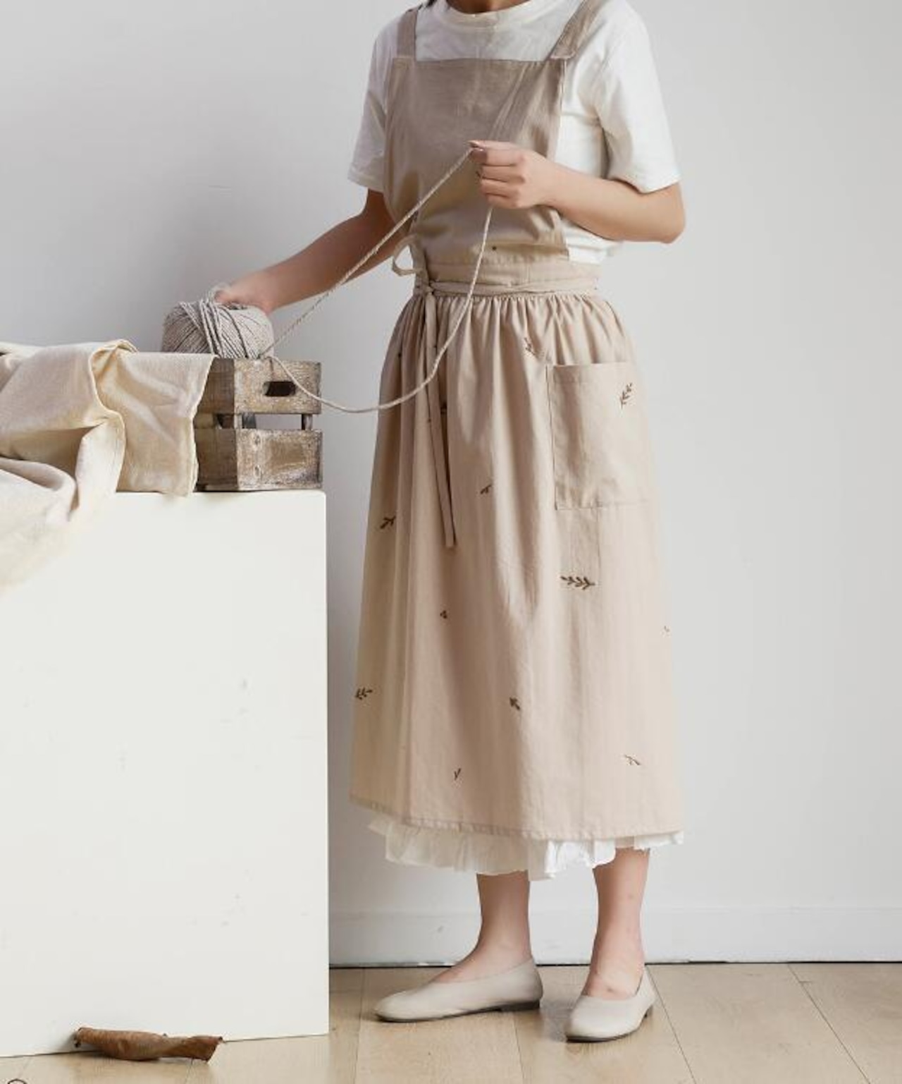 ワンピースエプロン コットンリネンエプロン 防汚&撥水 前掛け 作業着エプロン