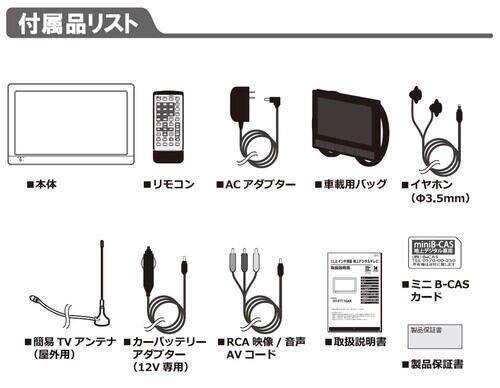 付属品:リモコン、ACアダプター、車載用DCアダプター、簡易TVアンテナ、イヤホン、車載用バック、miniB-CASカード、AVケーブル、取扱説明書・保証書