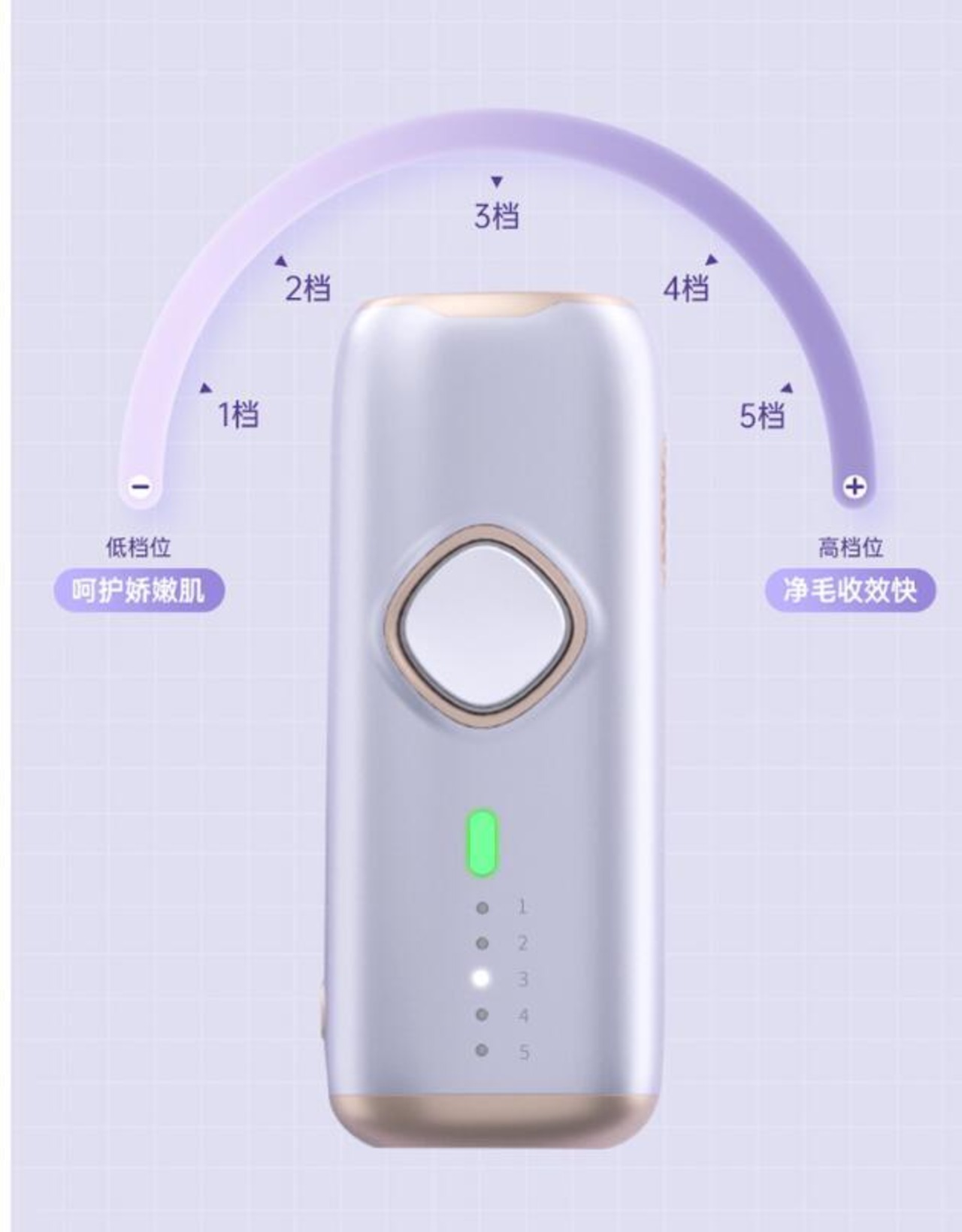 照射強度は5段階に調整可能で、肌の調子や肌の明るさに応じてフラッシュレベルを使い分け、肌の耐性に応じて、不快感や痛伴わない脱毛を実現します。