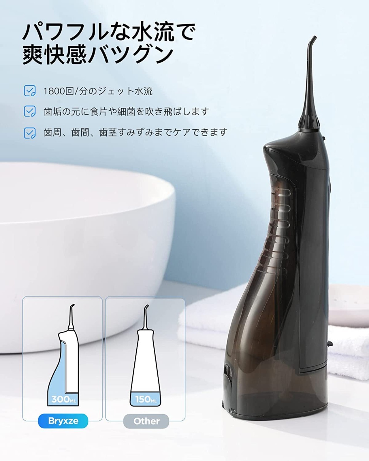 【300ml大容量水タンク/USB充電式】口内洗浄器の水タンクは約300mlの大容量サイズで、途中で水を補充する回数が減り、じっくり時間をかけてケアできます。1日約2分のケアで口臭予防や歯茎の健康を推進します。大容量バッテリーが搭載されており、4時間のフル充電で約三週間使用できます。USB充電式なので場所も選ばずに充電が可能です。