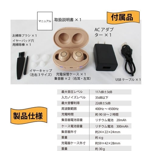・付属品:本体、イヤーキャップ3サイズ、ACアダプター USBケーブル、掃除セット、充電ケース