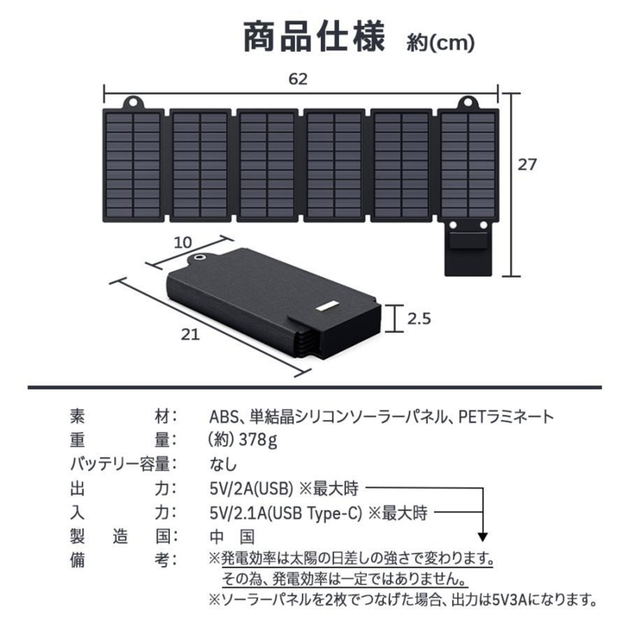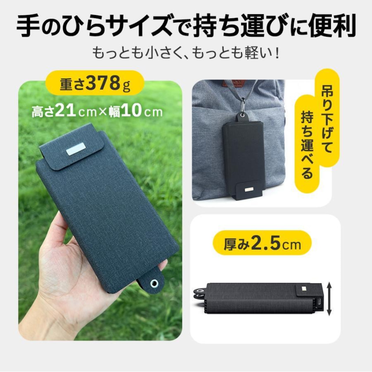 折りたたみソーラーパネルは軽量(約378g)、持ち運びに便利なサイズに折りたたむことができます。