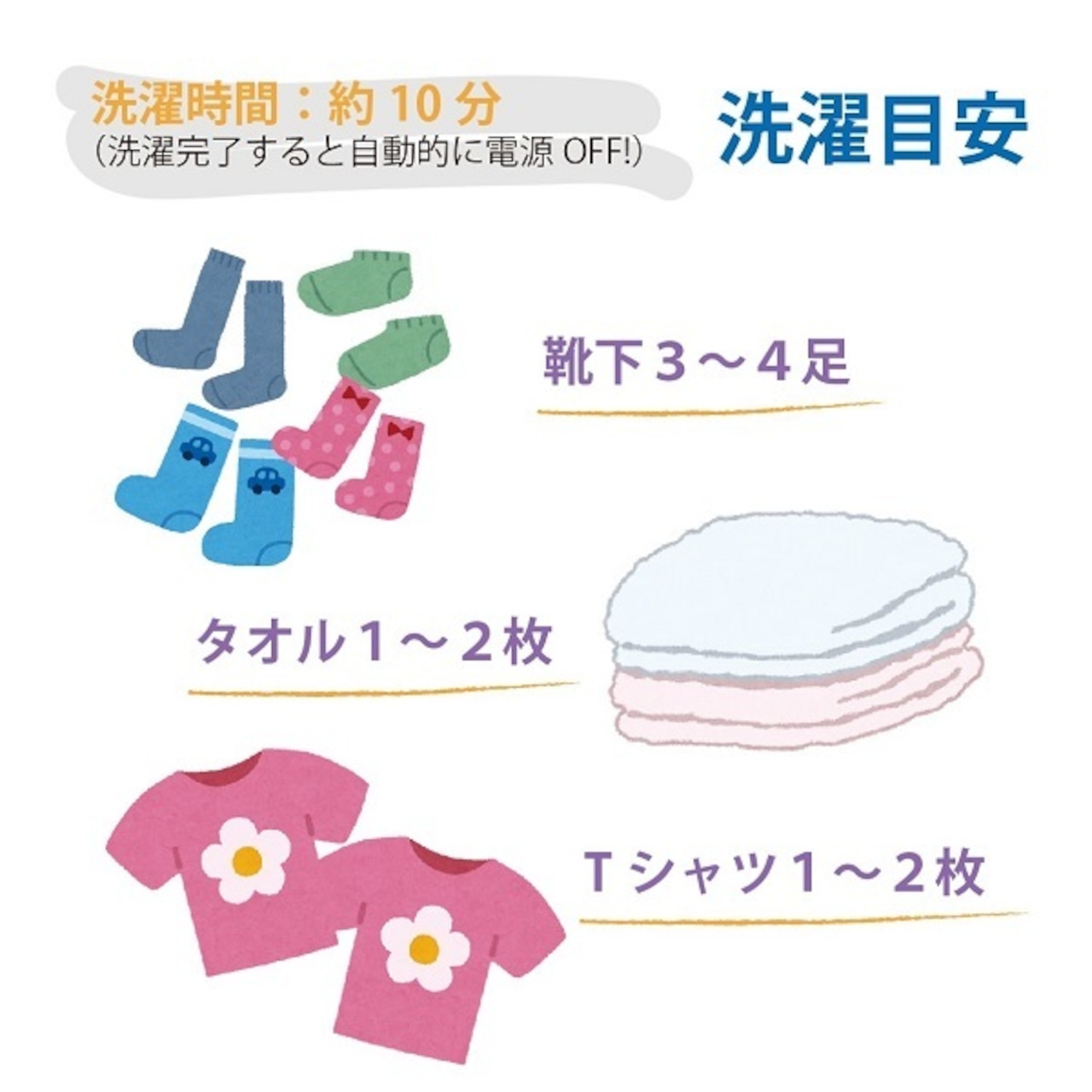 洗濯目安:靴下3-4足、フェイスタオル1-2枚、Tシャツ1-2枚