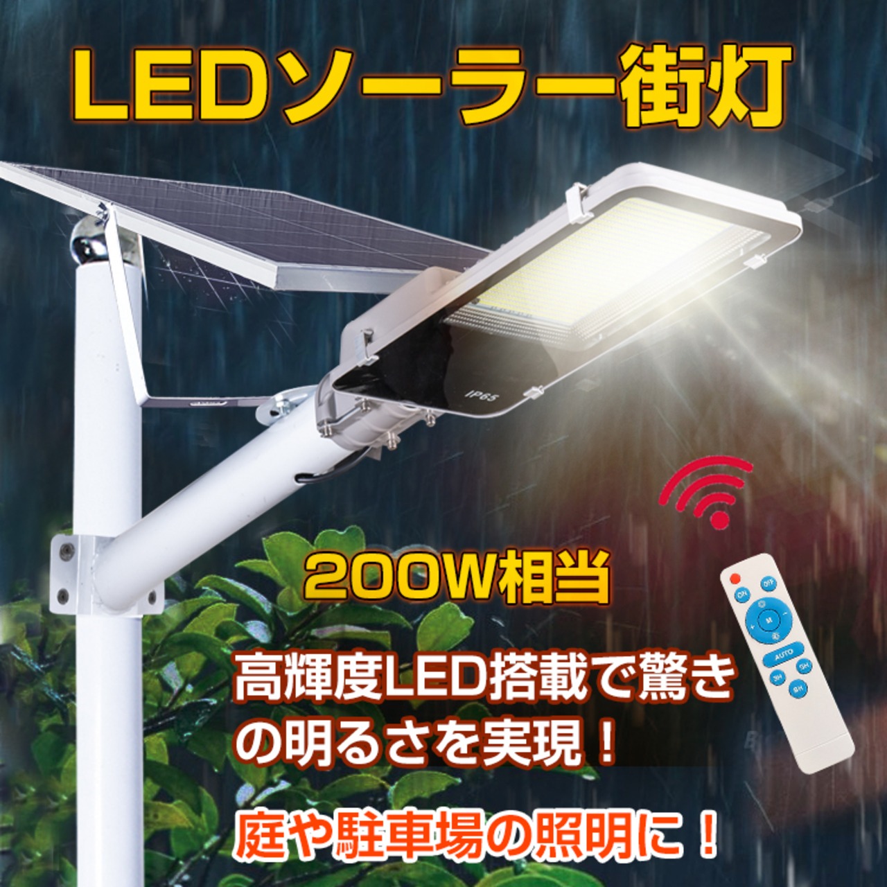 LEDソーラー街灯 ガーデンライト ソーラー充電 外灯 駐車場 防犯 投光器 配線不要 200W相当 夜間自動点灯