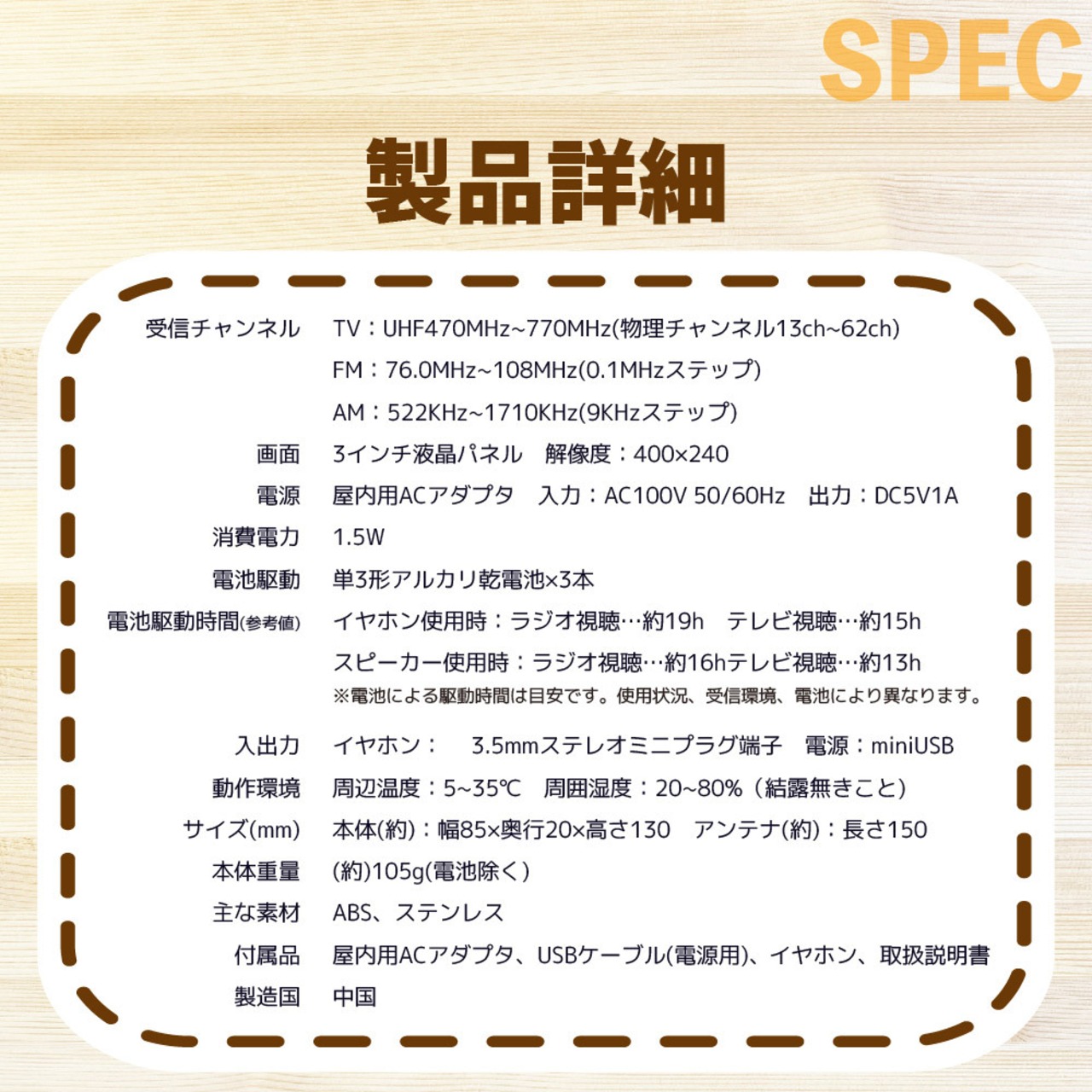 単3アルカリ乾電池3本あれば、ラジオもワンセグテレビも視聴できるため万が一の災害時にもご使用いただけます。