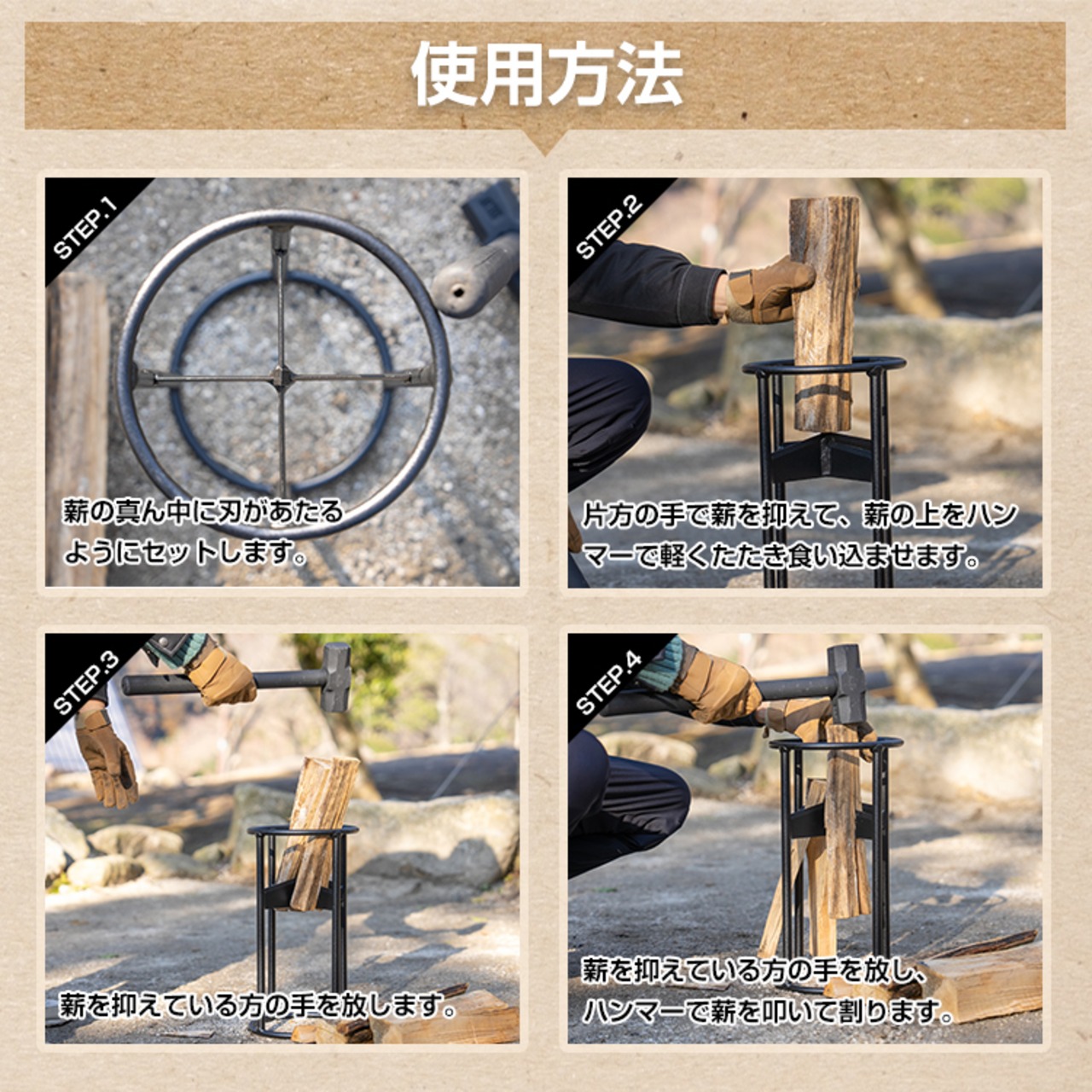 ■薪割り作業が安全、簡単、スピーディーに!>■薪割り台に薪を設置し、ハンマーで叩くだけ