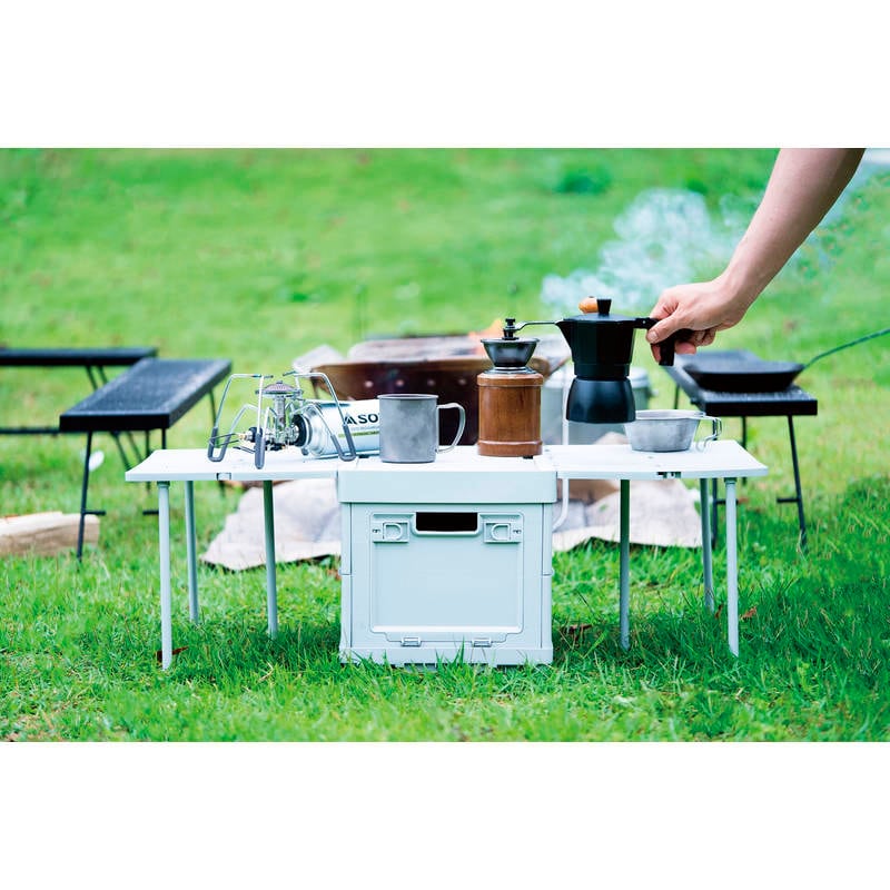 コンテナボックスとしても使用可能。展開すればテーブルとしても使用可能な便利な収納ボックス。ピクニック、アウトドア、お家の収納に・耐荷重/天板:約25kg、サイドテーブル:各約6kg
