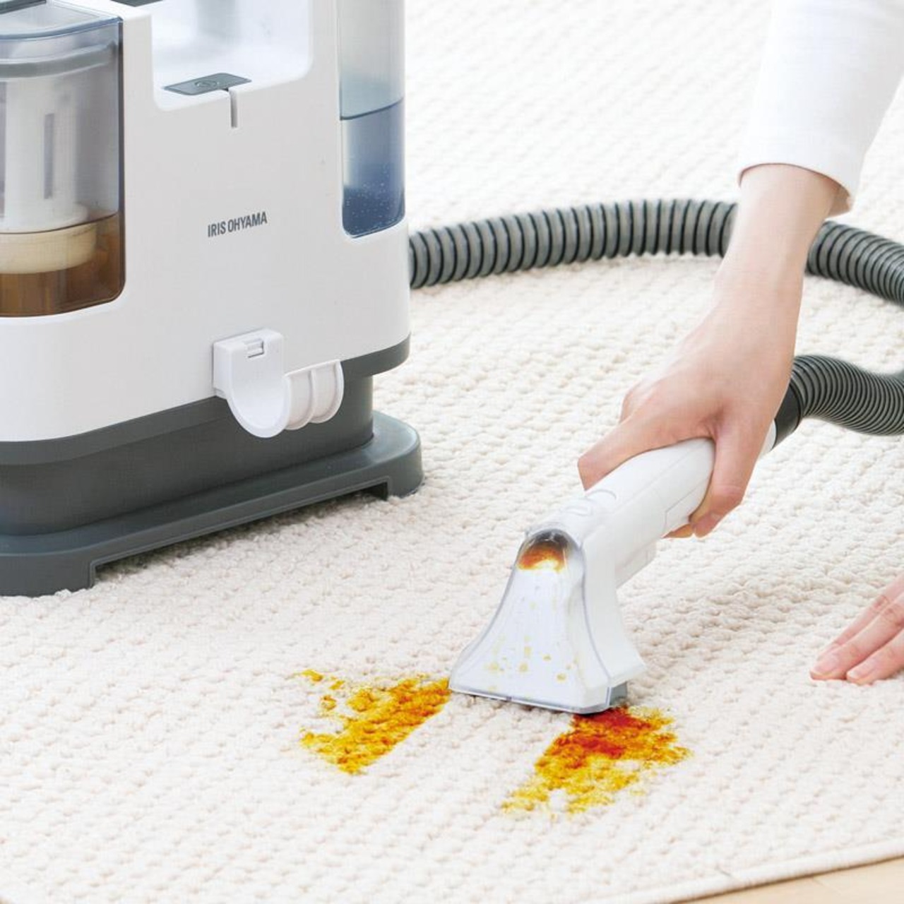 水を吹きかけ汚れを浮かせ、浮かせた汚れを水と共に吸い取ることができるリンサークリーナーです。電動ポンプ付きで、レバーを引くだけでラクに水を吹きかけることが出来ます。ソファや車のシートなど、布製品の洗浄に最適です。ブラシ付きヘッドで、汚れをかき出し吸引できます。T型ヘッドで、汚れの溜まりやすい隅や溝の汚れも吸引できます。●清水タンク容量:1.1L●回収タンク有効容量:0.4L●ホースの長さ:1.2m