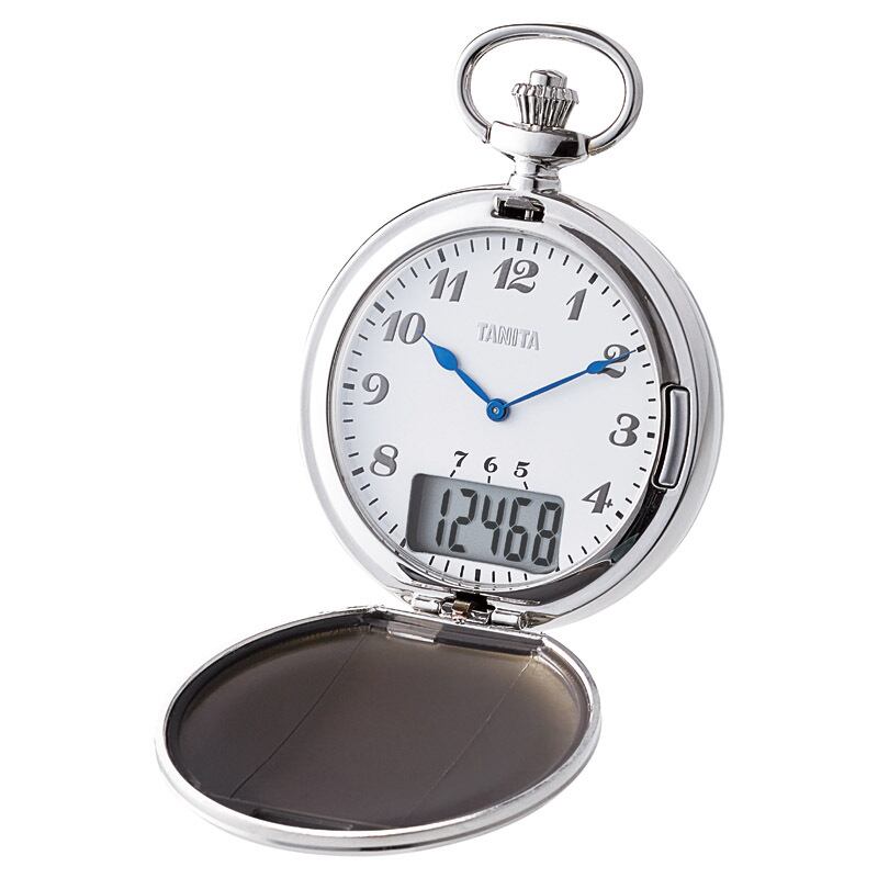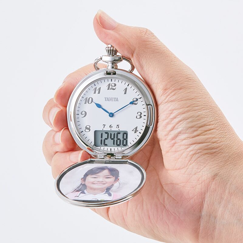懐中時計をモチーフにした歩数計。懐中時計の内側に思い出の写真やメッセージを入れることができるので、プレゼントにおすすめ。アナログ時計の文字盤にデジタルの歩数表示。身につけるだけの3Dセンサー搭載。面倒な設定は一切不要。お試し用ボタン電池1個付。
