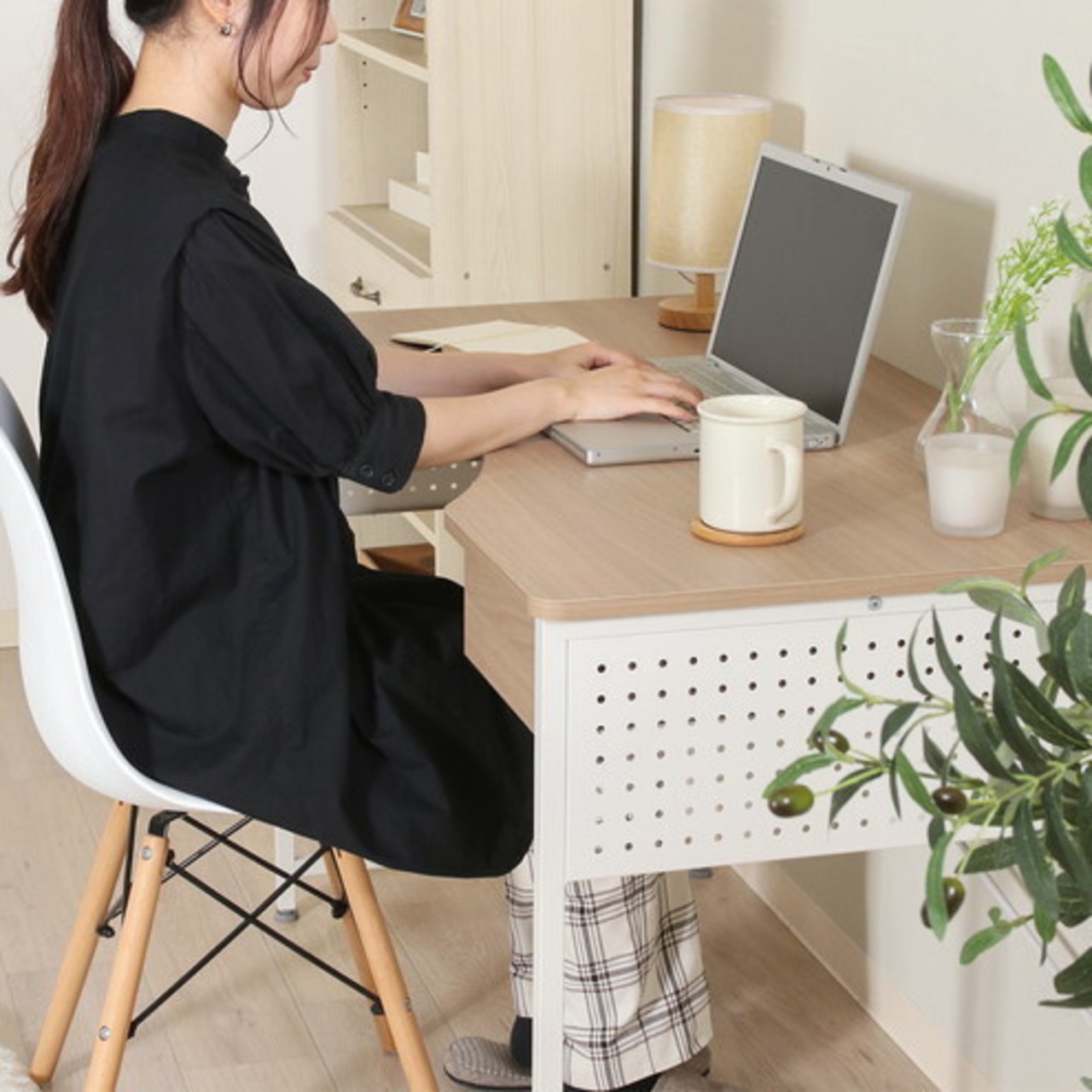 材質:■甲板の表面材:合成樹脂化粧繊維板(メラミン樹脂) ■構造部材(引出板):合成樹脂化粧繊維板(メラミン樹脂) ■構造部材(脚部フレーム/パンチングボード):金属(鋼) ■表面加工(脚部フレーム/パンチングボード):エポキシ樹脂塗装