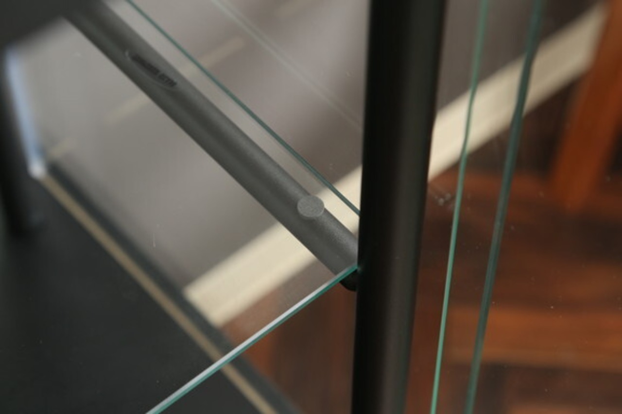 材質:■構造部材(背板・側板・扉板・棚板):強化ガラス ■構造部材(天板・地板):プリント紙化粧繊維板 ■構造部材(脚部):金属(鋼) ■表面加工(脚部):エポキシ樹脂塗装 ■表面加工(柱部):めっき(クロム)