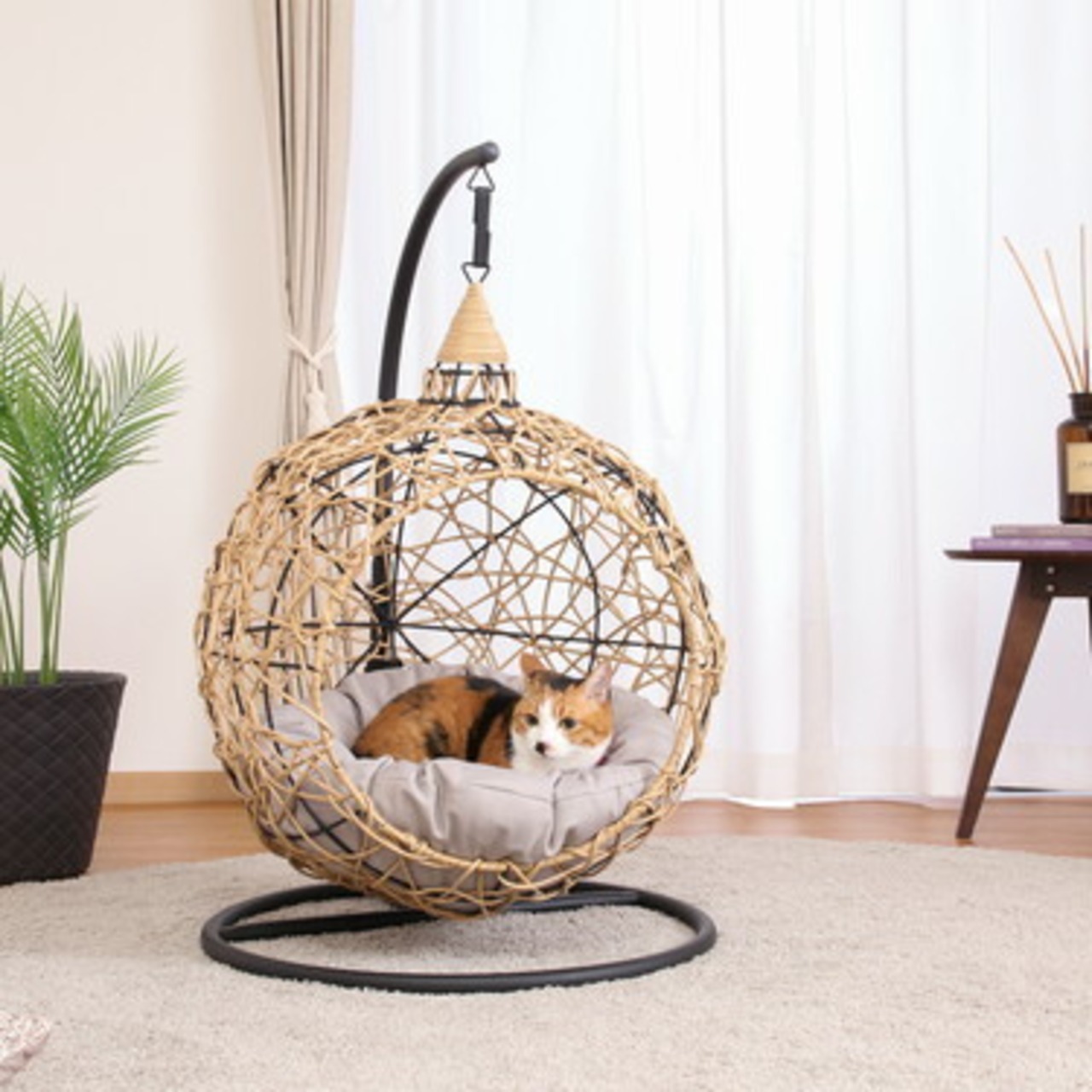 程よい揺れを楽しめるハンギングチェアはペットにとっても癒しのアイテム。専用のリラックス空間を堪能できます。